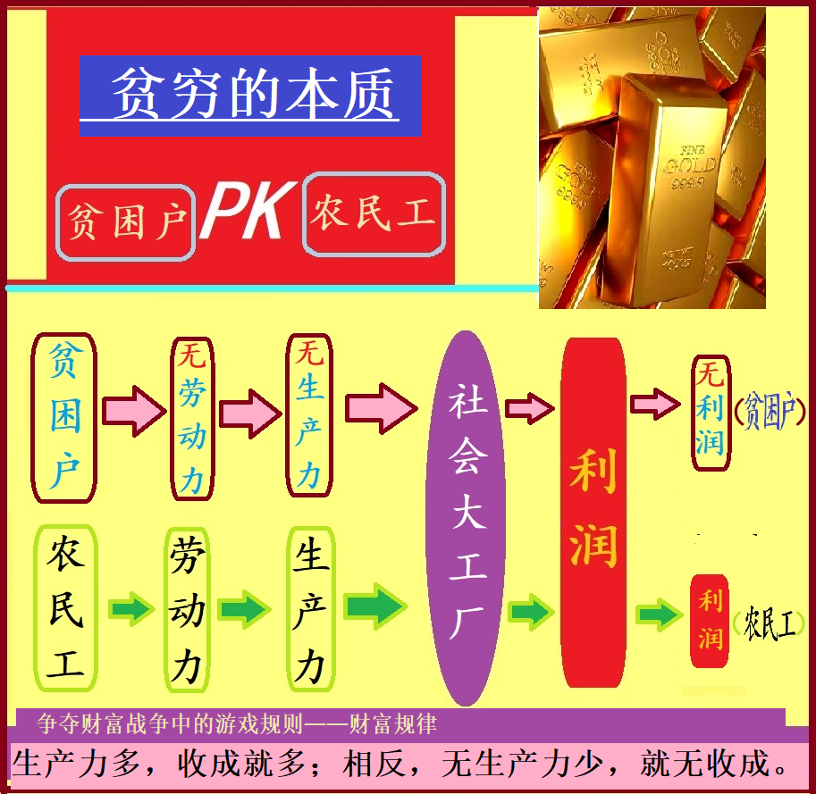 贫穷的本质表面现象是:生产力数量差异导致的,贫困户无劳动力,无收成;农民工有劳动力,有工薪。