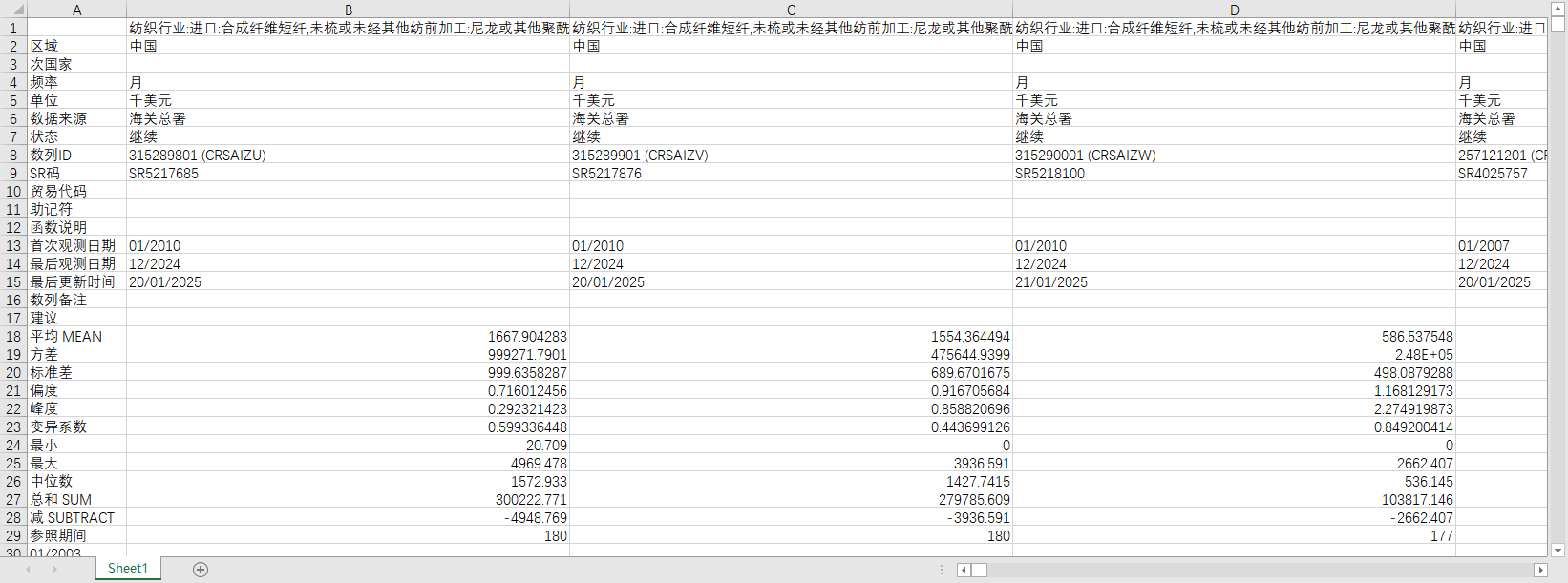 纺织行业:进口:合成纤维短纤,未梳或未经其他纺前加工:尼龙或其他聚酰胺:芳族聚酰胺纺制:聚间苯二甲酰间苯二胺 纺织行业:进口:合成纤维短纤,未梳或未经其他纺前加工:尼龙或其他聚酰胺:芳族聚酰胺纺制:聚对苯二甲酰对苯二胺 纺织行业:进口:合成纤维短纤,未梳或未经其他纺前加工:尼龙或其他聚酰胺:芳族聚酰胺纺制:其他 纺织行业:进口:合成纤维短纤,未梳或未经其他纺前加工:尼龙或其他聚酰胺:其他 纺织行业:进口:合成纤维短纤,未梳或未经其他纺前加工:聚酯制 纺织行业:进口:合成纤维短纤,未梳或未经其他纺前加工:聚丙烯腈或变性聚丙烯腈制 纺织行业:进口:合成纤维短纤,未梳或未经其他纺前加工:聚丙烯制 纺织行业:进口:合成纤维短纤,未梳或未经其他纺前加工:聚苯硫醚短纤 纺织行业:进口:合成纤维短纤,未梳或未经其他纺前加工:其他合成纤维短纤 纺织行业:进口:人造纤维短纤,未梳或未经其他纺前加工:粘胶纤维制:竹制 纺织行业:进口:人造纤维短纤,未梳或未经其他纺前加工:粘胶纤维制:木制:阻燃 纺织行业:进口:人造纤维短纤,未梳或未经其他纺前加工:粘胶纤维制:木制:其他 纺织行业:进口:人造纤维短纤,未梳或未经其他纺前加工:粘胶纤维制:其他 纺织行业:进口:人造纤维短纤,未梳或未经其他纺前加工:其他 纺织行业:进口:化学纤维废料:合成 纺织行业:进口:化学纤维废料:人造 纺织行业:进口:合成纤维短纤,已梳或经其他纺前加工:尼龙或其他聚酰胺:芳族聚酰胺纺制:聚间苯二甲酰间苯二胺 纺织行业:进口:合成纤维短纤,已梳或经其他纺前加工:尼龙或其他聚酰胺:芳族聚酰胺纺制:聚对苯二甲酰对苯二胺 纺织行业:进口:合成纤维短纤,已梳或经其他纺前加工:尼龙或其他聚酰胺:芳族聚酰胺纺制:其他 纺织行业:进口:合成纤维短纤,已梳或经其他纺前加工:尼龙或其他聚酰胺:其他 纺织行业:进口:合成纤维短纤,已梳或经其他纺前加工:聚酯制 纺织行业:进口:合成纤维短纤,已梳或经其他纺前加工:聚丙烯腈或变性聚丙烯腈制 纺织行业:进口:合成纤维短纤,已梳或经其他纺前加工:聚苯硫醚短纤 纺织行业:进口:合成纤维短纤,已梳或经其他纺前加工:其他合成纤维短纤 纺织行业:进口:人造纤维短纤,已梳或经其他纺前加工 纺织行业:进口:化学纤维短纤纺制的缝纫线:合成 纺织行业:进口:化学纤维短纤纺制的缝纫线:人造 纺织行业:进口:非零售合成纤维纺制的纱线:按重量计含尼龙或其它聚酰胺≥85%:单纱 纺织行业:进口:非零售合成纤维纺制的纱线:按重量计含尼龙或其它聚酰胺≥85%:多股纱线或缆线 纺织行业:进口:非零售合成纤维纺制的纱线:按重量计含聚酯短纤≥85%:单纱 纺织行业:进口:非零售合成纤维纺制的纱线:按重量计含聚酯短纤≥85%:多股纱线或缆线 纺织行业:进口:非零售合成纤维纺制的纱线:按重量计含聚丙烯腈或其变形≥85%:单纱 纺织行业:进口:非零售合成纤维纺制的纱线:按重量计含聚丙烯腈或其变形≥85%:多股纱线或缆线 纺织行业:进口:非零售合成纤维纺制的纱线:按重量计含其它合成纤维短纤≥85%:单纱 纺织行业:进口:非零售合成纤维纺制的纱线:按重量计含其它合成纤维短纤≥85%:多股纱线或缆线 纺织行业:进口:非零售合成纤维纺制的纱线:其他聚酯短纤:与人造纤维短纤混纺 纺织行业:进口:非零售合成纤维纺制的纱线:其他聚酯短纤:与羊毛或动物毛混纺 纺织行业:进口:非零售合成纤维纺制的纱线:其他聚酯短纤:与棉混纺 纺织行业:进口:非零售合成纤维纺制的纱线:其他聚酯短纤:其他 纺织行业:进口:非零售合成纤维纺制的纱线:其他聚丙烯腈或其变形:与羊毛或动物毛混纺 纺织行业:进口:非零售合成纤维纺制的纱线:其他聚丙烯腈或其变形:与棉混纺 纺织行业:进口:非零售合成纤维纺制的纱线:其他聚丙烯腈或其变形:其他 纺织行业:进口:非零售合成纤维纺制的纱线:其他:与羊毛或动物毛混纺 纺织行业:进口:非零售合成纤维纺制的纱线:其他:与棉混纺 纺织行业:进口:非零售合成纤维纺制的纱线:其他:其他 纺织行业:进口:非零售人造纤维短纤纺制的纱线:按重量计人造纤维短纤≥85%:单纱 纺织行业:进口:非零售人造纤维短纤纺制的纱线:按重量计人造纤维短纤≥85%:多股纱线或缆线 纺织行业:进口:非零售人造纤维短纤纺制的纱线:与羊毛或动物细毛混纺 纺织行业:进口:非零售人造纤维短纤纺制的纱线:与棉混纺 纺织行业:进口:非零售人造纤维短纤纺制的纱线:其他 纺织行业:进口:零售化学纤维短纤纺制的纱线:按重量计合成纤维短纤≥85% 纺织行业:进口:零售化学纤维短纤纺制的纱线:按重量计合成纤维短纤<85% 纺织行业:进口:零售化学纤维短纤纺制的纱线:人造纤维短纤纺制 纺织行业:进口:合成纤维短纤纺制的机织物:按重量计含聚酯短纤≥85%:未漂白或漂白 纺织行业:进口:合成纤维短纤纺制的机织物:按重量计含聚酯短纤≥85%:其他 纺织行业:进口:合成纤维短纤纺制的机织物:按重量计含聚丙烯腈或其变性≥85%:未漂白或漂白 纺织行业:进口:合成纤维短纤纺制的机织物:按重量计含聚丙烯腈或其变性≥85%:其他 纺织行业:进口:合成纤维短纤纺制的机织物:按重量计其他短纤≥85%:未漂白或漂白 纺织行业:进口:合成纤维短纤纺制的机织物:按重量计其他短纤≥85%:其他 纺织行业:进口:合成纤维短纤纺制的机织物:按重量计聚酯短纤<85%,与棉混纺,