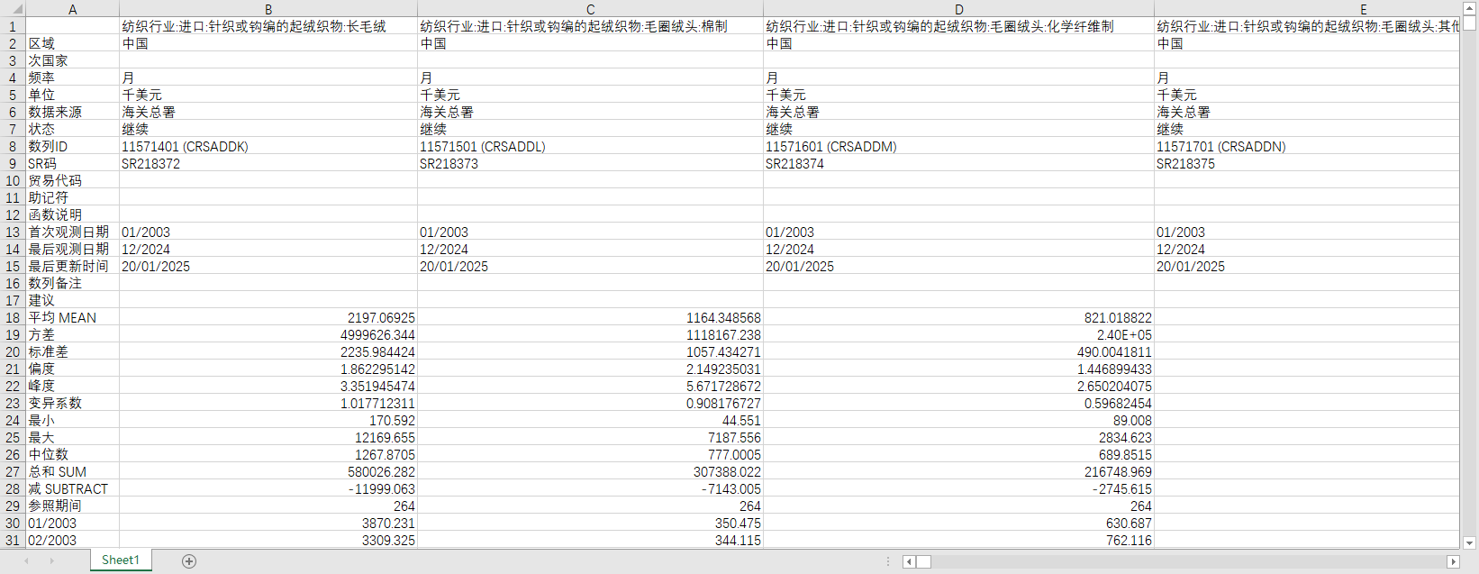 纺织行业:进口:针织或钩编的起绒织物:长毛绒 纺织行业:进口:针织或钩编的起绒织物:毛圈绒头:棉制 纺织行业:进口:针织或钩编的起绒织物:毛圈绒头:化学纤维制 纺织行业:进口:针织或钩编的起绒织物:毛圈绒头:其他纺织材料制 纺织行业:进口:针织或钩编的起绒织物:其他:棉制 纺织行业:进口:针织或钩编的起绒织物:其他:化学纤维制 纺织行业:进口:针织或钩编的起绒织物:其他:其他纺织材料制 纺织行业:进口:针织物或钩编织物,宽度≤30cm:含弹性纱或橡胶线≥5%:含弹性纱≥5%,但不含橡胶线:棉制 纺织行业:进口:针织物或钩编织物,宽度≤30cm:含弹性纱或橡胶线≥5%:含弹性纱≥5%,但不含橡胶线:丝及绢丝制 纺织行业:进口:针织物或钩编织物,宽度≤30cm:含弹性纱或橡胶线≥5%:含弹性纱≥5%,但不含橡胶线:合成纤维制 纺织行业:进口:针织物或钩编织物,宽度≤30cm:含弹性纱或橡胶线≥5%:含弹性纱≥5%,但不含橡胶线:人造纤维制 纺织行业:进口:针织物或钩编织物,宽度≤30cm:含弹性纱或橡胶线≥5%:含弹性纱≥5%,但不含橡胶线:其他 纺织行业:进口:针织物或钩编织物,宽度≤30cm:含弹性纱或橡胶线≥5%:其他:棉制 纺织行业:进口:针织物或钩编织物,宽度≤30cm:含弹性纱或橡胶线≥5%:其他:丝及绢丝制 纺织行业:进口:针织物或钩编织物,宽度≤30cm:含弹性纱或橡胶线≥5%:其他:合成纤维制 纺织行业:进口:针织物或钩编织物,宽度≤30cm:含弹性纱或橡胶线≥5%:其他:人造纤维制 纺织行业:进口:针织物或钩编织物,宽度≤30cm:含弹性纱或橡胶线≥5%:其他:其他 纺织行业:进口:针织物或钩编织物,宽度≤30cm:羊毛或动物细毛制 纺织行业:进口:针织物或钩编织物,宽度≤30cm:棉制 纺织行业:进口:针织物或钩编织物,宽度≤30cm:合成纤维制 纺织行业:进口:针织物或钩编织物,宽度≤30cm:人造纤维制 纺织行业:进口:针织物或钩编织物,宽度≤30cm:其他 纺织行业:进口:针织物或钩编织物,宽度>30cm:含弹性纱或橡胶线≥5%:含弹性纱≥5%,但不含橡胶线:棉制 纺织行业:进口:针织物或钩编织物,宽度>30cm:含弹性纱或橡胶线≥5%:含弹性纱≥5%,但不含橡胶线:丝及绢丝制 纺织行业:进口:针织物或钩编织物,宽度>30cm:含弹性纱或橡胶线≥5%:含弹性纱≥5%,但不含橡胶线:合成纤维制 纺织行业:进口:针织物或钩编织物,宽度>30cm:含弹性纱或橡胶线≥5%:含弹性纱≥5%,但不含橡胶线:人造纤维制 纺织行业:进口:针织物或钩编织物,宽度>30cm:含弹性纱或橡胶线≥5%:含弹性纱≥5%,但不含橡胶线:其他 纺织行业:进口:针织物或钩编织物,宽度>30cm:含弹性纱或橡胶线≥5%:其他:棉制 纺织行业:进口:针织物或钩编织物,宽度>30cm:含弹性纱或橡胶线≥5%:其他:丝及绢丝制 纺织行业:进口:针织物或钩编织物,宽度>30cm:含弹性纱或橡胶线≥5%:其他:合成纤维制 纺织行业:进口:针织物或钩编织物,宽度>30cm:含弹性纱或橡胶线≥5%:其他:人造纤维制 纺织行业:进口:针织物或钩编织物,宽度>30cm:含弹性纱或橡胶线≥5%:其他:其他 纺织行业:进口:经编织物:棉制:未漂白或漂白 纺织行业:进口:经编织物:棉制:染色 纺织行业:进口:经编织物:棉制:色织 纺织行业:进口:经编织物:棉制:印花 纺织行业:进口:经编织物:合成纤维制:未漂白或漂白 纺织行业:进口:经编织物:合成纤维制:染色 纺织行业:进口:经编织物:合成纤维制:色织 纺织行业:进口:经编织物:合成纤维制:印花 纺织行业:进口:经编织物:人造纤维制:未漂白或漂白 纺织行业:进口:经编织物:人造纤维制:染色 纺织行业:进口:经编织物:人造纤维制:色织 纺织行业:进口:经编织物:人造纤维制:印花 纺织行业:进口:经编织物:其他:羊毛或动物细毛制 纺织行业:进口:经编织物:其他:其他纺织材料制 纺织行业:进口:其它针织或钩编织物:羊毛或动物细毛制 纺织行业:进口:其它针织或钩编织物:棉制:未漂白或漂白 纺织行业:进口:其它针织或钩编织物:棉制:染色 纺织行业:进口:其它针织或钩编织物:棉制:色织 纺织行业:进口:其它针织或钩编织物:棉制:印花 纺织行业:进口:其它针织或钩编织物:合成纤维制:未漂白或漂白 纺织行业:进口:其它针织或钩编织物:合成纤维制:染色 纺织行业:进口:其它针织或钩编织物:合成纤维制:色织 纺织行业:进口:其它针织或钩编织物:合成纤维制:印花 纺织行业:进口:其它针织或钩编织物:人造纤维制:未漂白或漂白 纺织行业:进口:其它针织或钩编织物:人造纤维制:染色 纺织行业:进口:其它针织或钩编织物:人造纤维制:色织 纺织行业:进口:其它针织或钩编织物:人造纤维制:印花 纺织行业:进口:其它针织或钩编织物:其他 (DC)纺织行业:进口:毛制经编织物 (DC)纺织行业:进口:其它制经编织物 纺织行业:出口:针织或钩编的起绒织物:长毛绒 纺织行业:出口:针织或钩编的起绒织物:毛圈绒头:棉制 纺织行业:出口:针织或钩编的起绒织物:毛圈绒头:化学纤维制 纺织行业:出口:针织或钩编的起绒织物:毛圈绒头:其他纺织材料制 纺织行业:出口:针织或钩编的起绒织物:其他:棉制 纺织行业:出口:针织或钩编的起绒织物:其他:化学纤维制 纺织行业:出口:针织或钩编的起绒织物:其他:其他纺织材料制 纺织行业:出口:针织物或钩编织物,宽度≤30cm:含弹性纱或橡胶线≥5%:含弹性纱≥5%,但不含橡胶线:棉制 纺织行业:出口:针织物或钩编织物,宽度≤30cm:含弹性纱或橡胶线≥5%:含弹性纱≥5%,但不含橡胶线:丝及绢丝制 纺织行