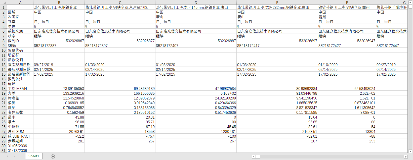 热轧带钢:开工率:钢铁企业 热轧带钢:开工率:钢铁企业:京津冀地区 热轧带钢:开工率:宽<145mm:钢铁企业:唐山 热轧带钢:开工率:宽≥232mm:钢铁企业:唐山 镀锌带钢:开工率:钢铁企业:霸州 热轧带钢:产能利用率:钢铁企业 热轧带钢:产能利用率:钢铁企业:京津冀地区 热轧带钢:产能利用率:宽<145mm:钢铁企业:唐山 热轧带钢:产能利用率:宽≥232mm:钢铁企业:唐山 镀锌带钢:产能利用率:钢铁企业:霸州 热轧带钢:库存:钢铁企业 热轧带钢:社会库存 热轧带钢:社会库存:河北:邯郸 热轧带钢:社会库存:河北:唐山 热轧带钢:社会库存:天津 热轧带钢:社会库存:山东:济南:莱芜 热轧带钢:社会库存:浙江:宁波 热轧带钢:社会库存:江苏:无锡 热轧带钢:社会库存:广东:佛山:顺德:乐从 板带材:社会库存:上海