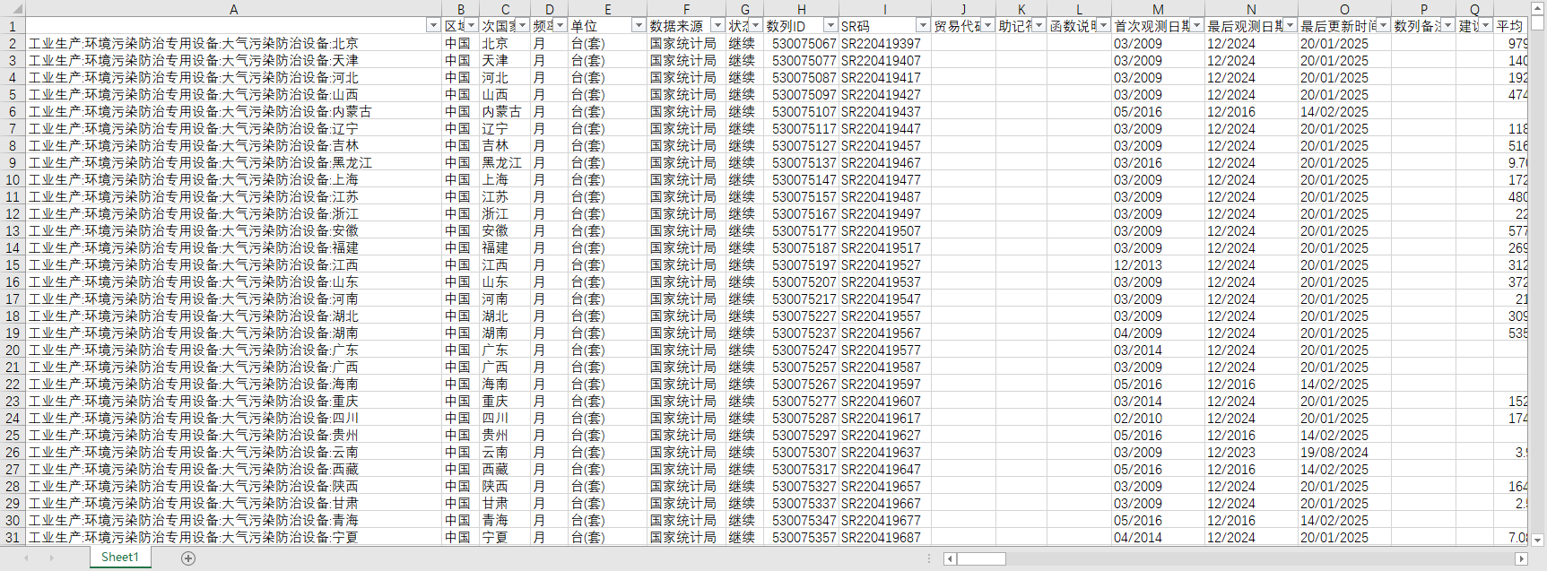 工业生产产品产量环境污染防治专用设备大气污染防治设备细分31个省份地区2009-2024月度及累计数据