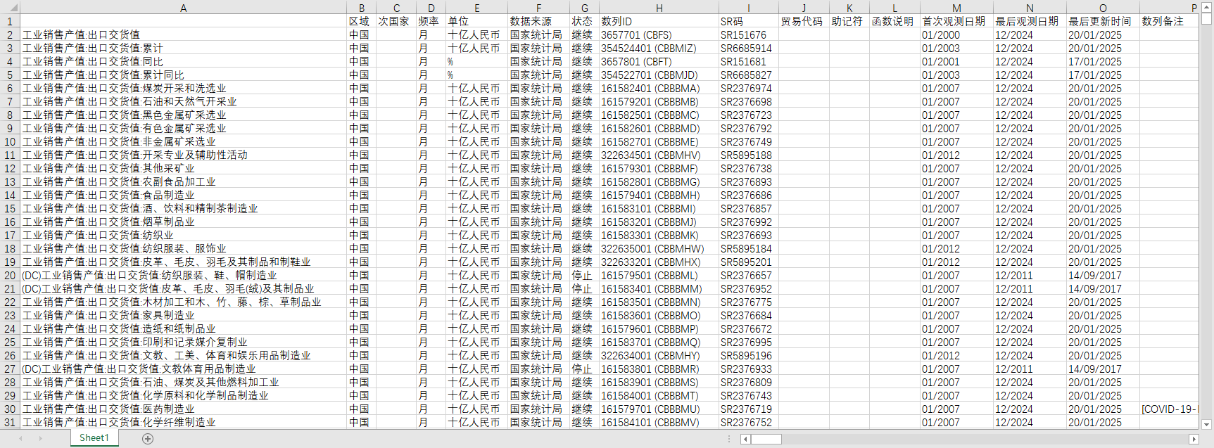 全国工业产品销售出口交货值细分行业2007-2024月度数据全国