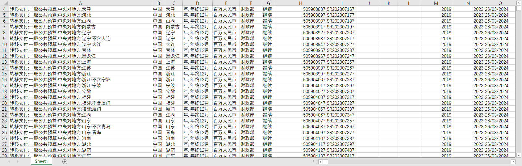 全国财政决算中央对地方转移支付2019-2023分31个省份一般性专项一般公共预算政府性基金国有资本经营