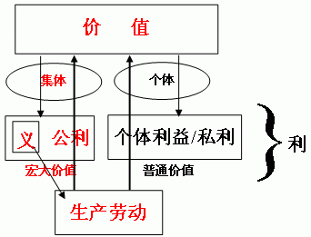 在义的设计中,考虑的是行为和行为的推动力、行为及推动力的效果。图中,一个箭头从义指向生产劳动。