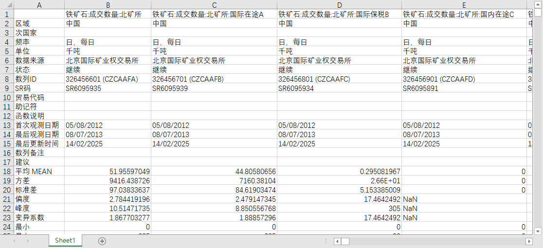 铁矿石:成交数量:北矿所 铁矿石:成交数量:北矿所:国际在途A 铁矿石:成交数量:北矿所:国际保税B 铁矿石:成交数量:北矿所:国内在途C 铁矿石:成交数量:北矿所:国内港口D 铁矿石:成交金额(美元交易):北矿所 铁矿石:成交金额(美元交易):北矿所:国际在途A 铁矿石:成交金额(美元交易):北矿所:国际保税B 铁矿石:成交金额(人民币交易):北矿所 铁矿石:成交金额(人民币交易):北矿所:国内在途C 铁矿石:成交金额(人民币交易):北矿所:国内港口D