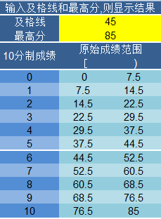 IF(round(原始成绩,0)<及格线分数,INT(round(原始成绩,0)/(及格线分数/6)),MIN(INT((round(原始成绩,0)-及格线分数)/((科目最高分-及格线分数)/5))+6,10))