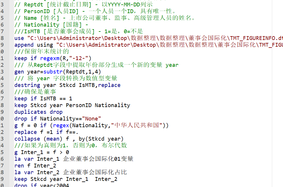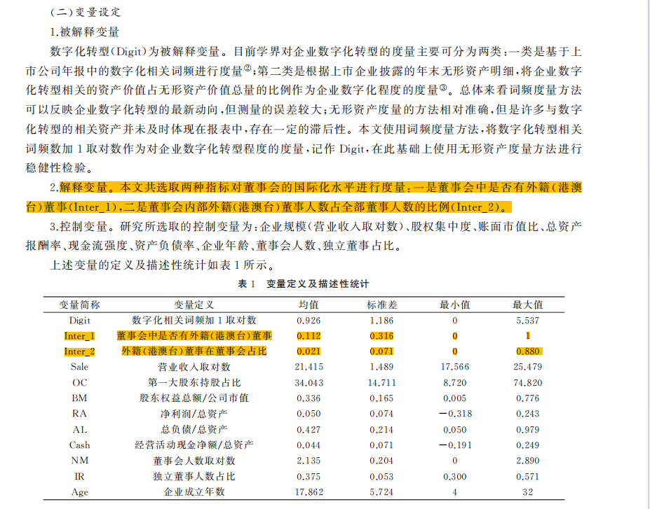 【1】样本量57166,Inter_1是01虚拟变量(是否具有外籍董事),Inter_2是占比(外籍董事占比),Inter_2_w是占比的缩尾(只是展示,实际操作中建议样本量确定后再缩尾)