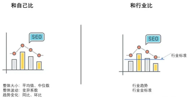 对比的对象可以是自己,也可以是行业。如果是和自己比的话,可以通过某段时间的业务平均值、中位数等统计指标来衡量业务的整体大小;也可以通过变异系数来衡量业务整体的波动;同时也可以使用同比、环比等指标来衡量业务的变化趋势。如果是和行业比较的话,可以通过行业趋势与业务发展趋势进行对比,以判断业务发展是否健康;当然也可以和行业的金标准进行对比,以确定业务发展是否达到行业标准,进而调整业务发展方向和策略!