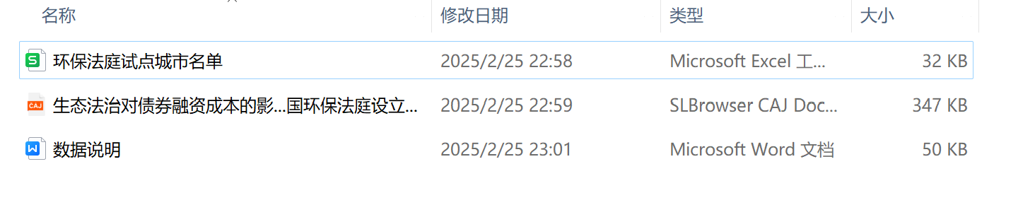 地级市环境权益法治保护政策支持(2002~2023年)环保法庭试点城市DID,可以进行以下研究:评估环保法庭效果:分析环保法庭对提升环境司法效率、促进环境权益保护的作用。探索政策影响机制:研究环保法庭试点政策在不同城市的实施效果及影响因素。提出改进建议:基于试点经验,提出完善地级市环境权益法治保护政策的建议。