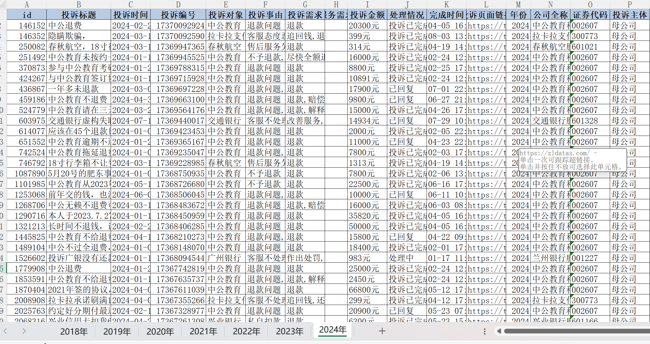 id 投诉标题 投诉时间 投诉编号 投诉对象 投诉事由 投诉需求 服务需求 投诉金额 处理情况 完成时间 投诉页面链接 年份 公司全称 证券代码 投诉主体