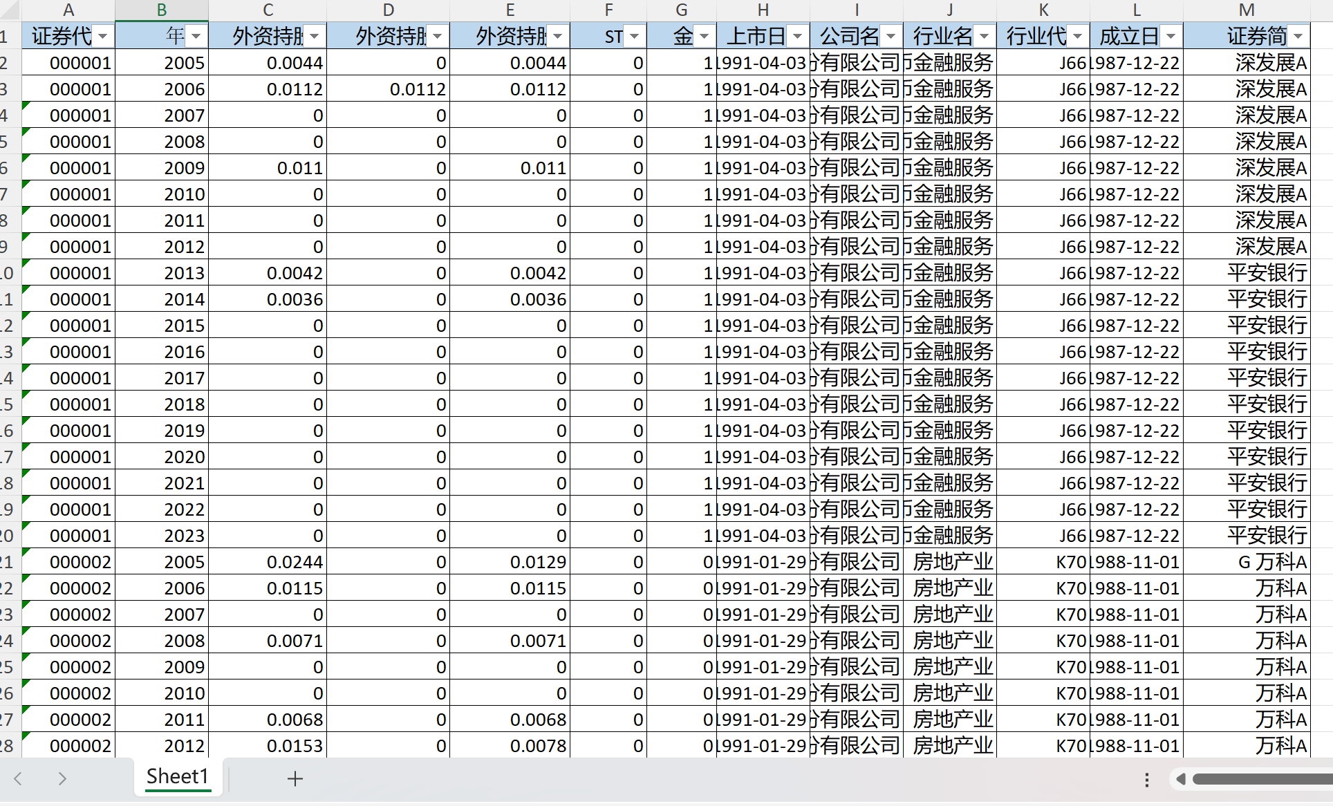 基于05-23年上市公司外国资本投资和参与程度(外资持股数据),可开展以下研究:外资持股趋势分析:研究外资持股的历年变化趋势。外资持股行业分布:分析外资在不同行业的持股偏好及影响。外资持股与公司绩效:探讨外资持股与上市公司财务绩效、市场表现的关系。
