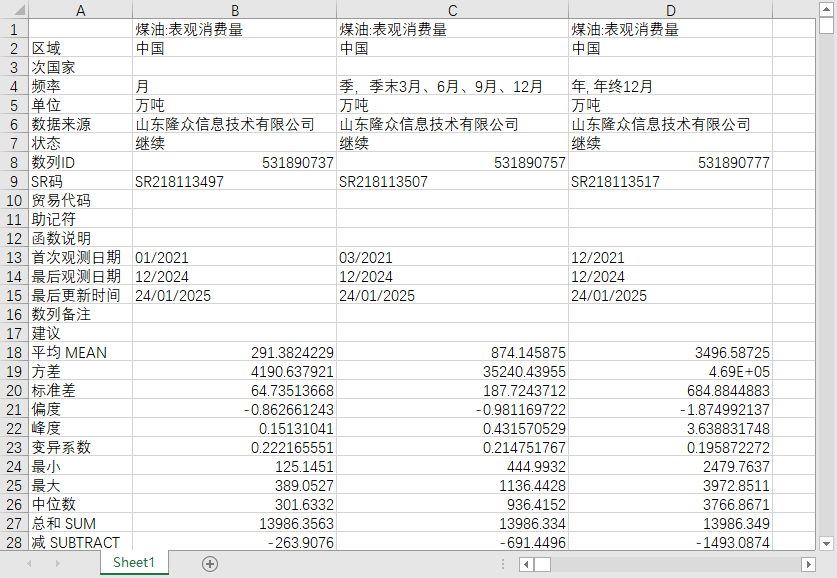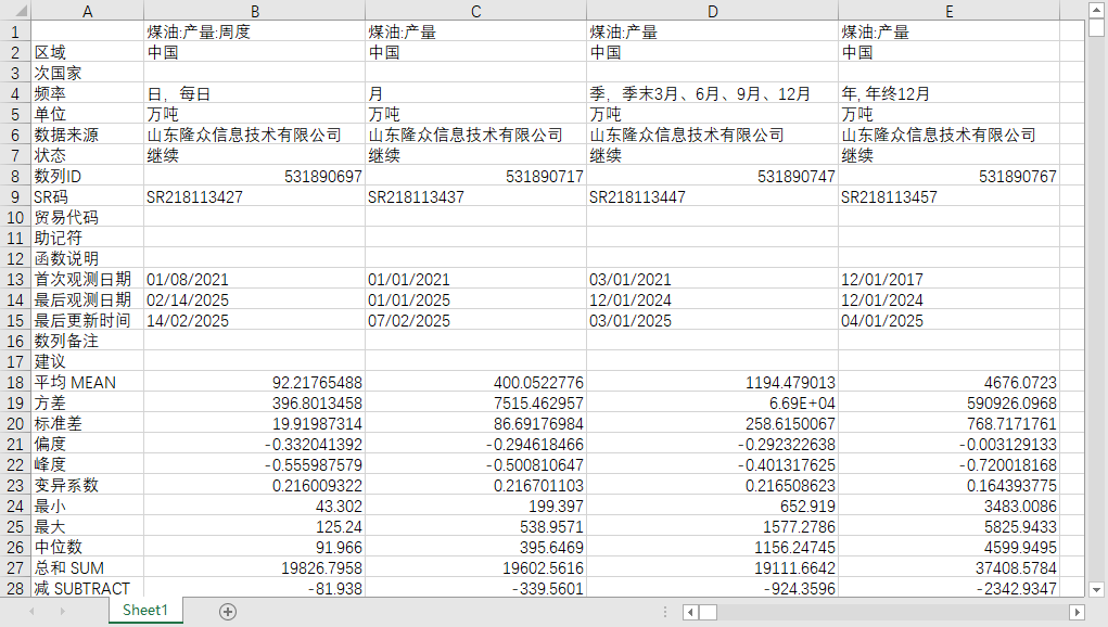 全国煤油产量周度2021-202502数据