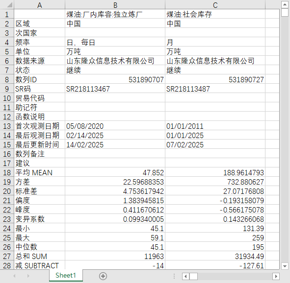 全国煤油产量表观消费量社会库存厂内库容独立炼厂2020-202502日度数据