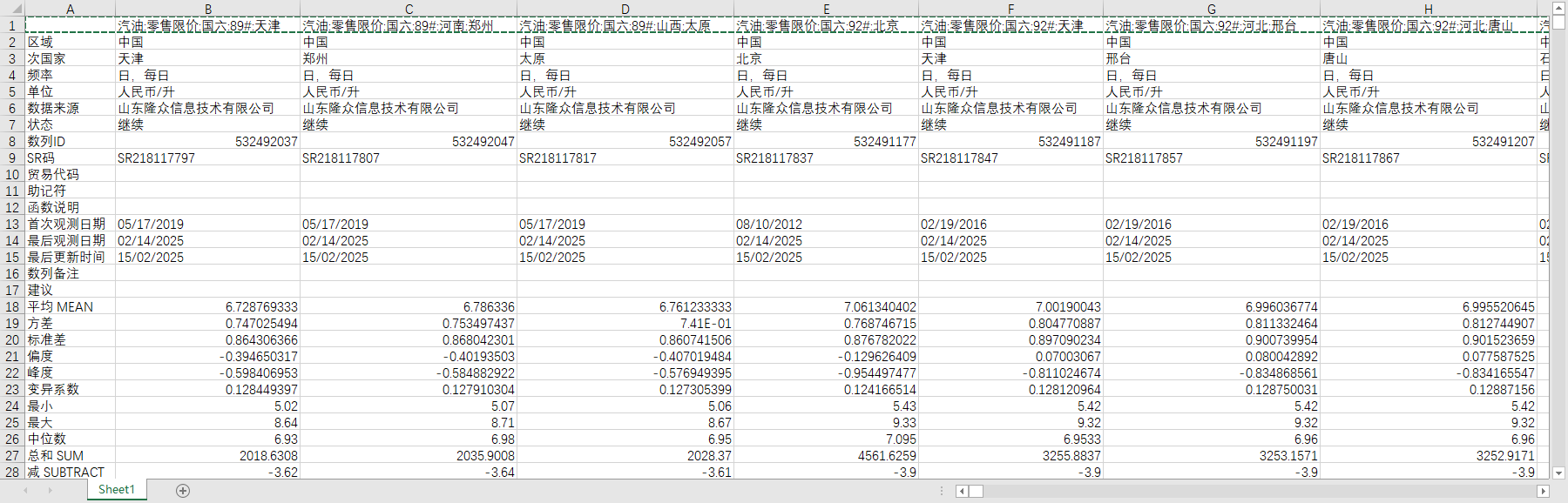 全国汽油零售限价批发限价出厂价2016-202502周度数据分省份重点城市国六92#95#98#汽油