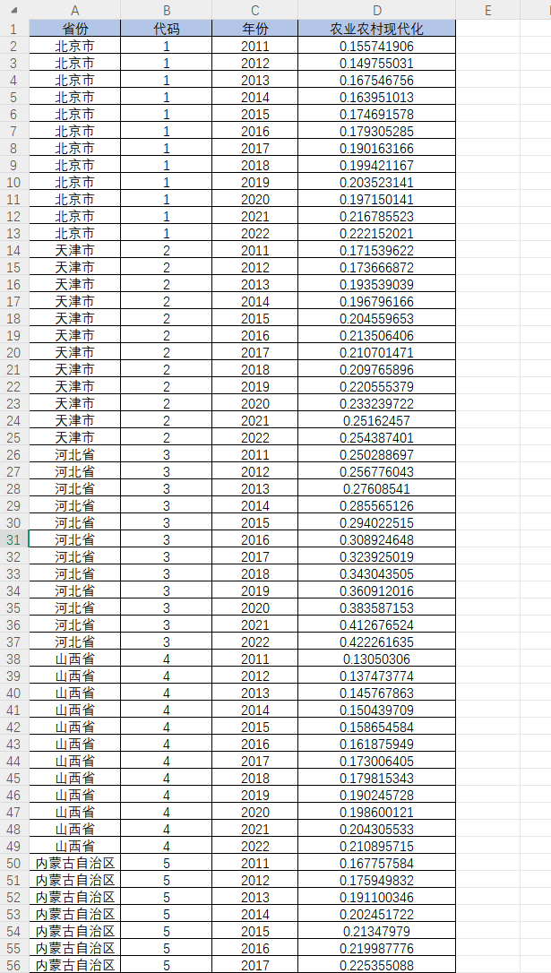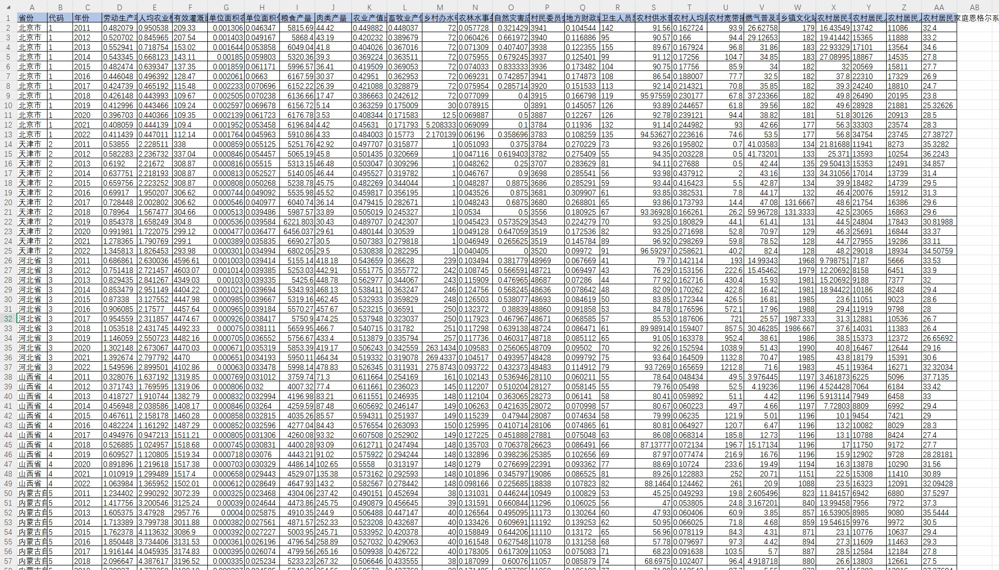 省份 代码 年份 劳动生产率 人均农业机械动力 有效灌溉面积 单位面积农药使用量 单位面积化肥使用量 粮食产量 肉类产量 农业产值比 畜牧业产值比 乡村办水电站个数 农林水事务支出占比 自然灾害应对能力 村民委员会 地方财政城乡社区事务支出占比 卫生人员覆盖率 农村供水普及率 农村人均用电量 农村宽带接入用户 燃气普及率 乡镇文化站 农村居民平均每百户年末家用汽车拥有量 农村居民人均可支配收入 农村居民人均消费支出 农村居民家庭恩格尔系数