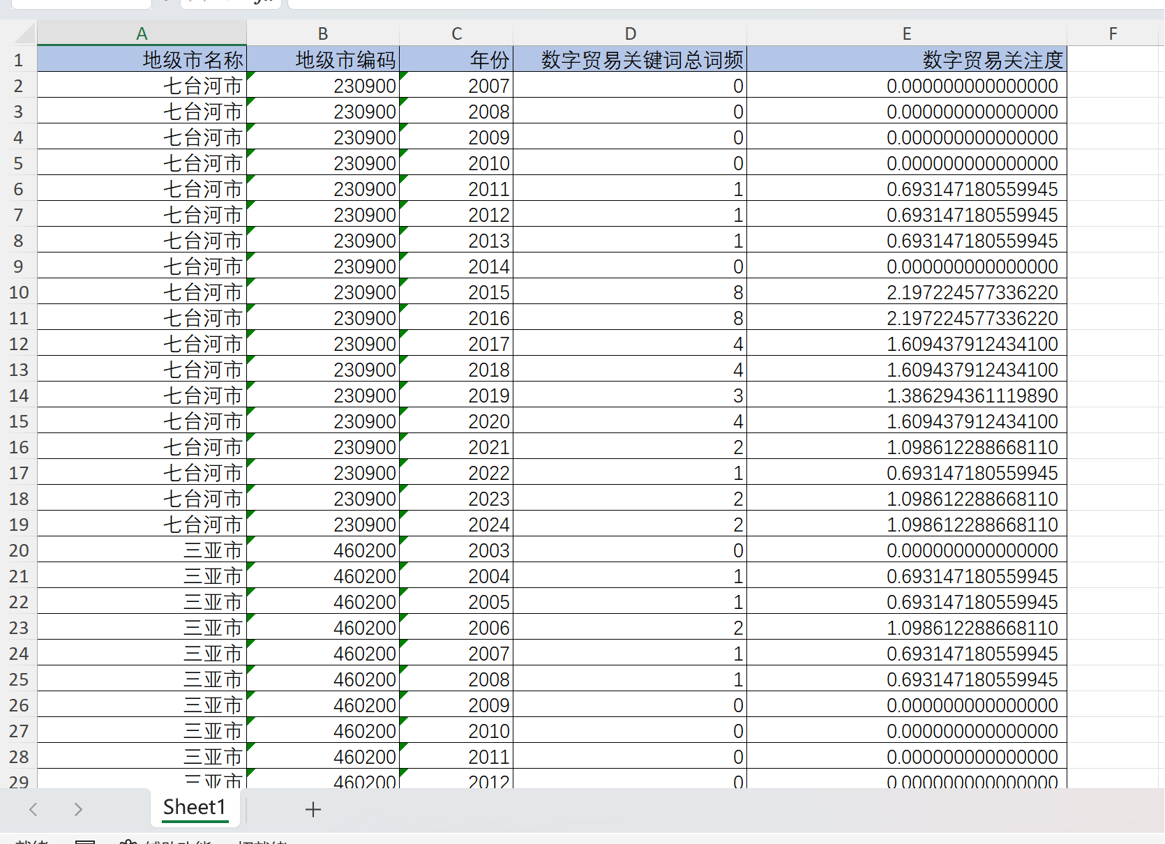 地级市名称、地级市编码、年份、数字、数字贸易关键词总词频(数字贸易 电子商务 跨境电商 网上交易 网上零售 网上购物 在线支付 移动支付 第三方支付 B2B B2C C2B O2O)、数字贸易关注度。