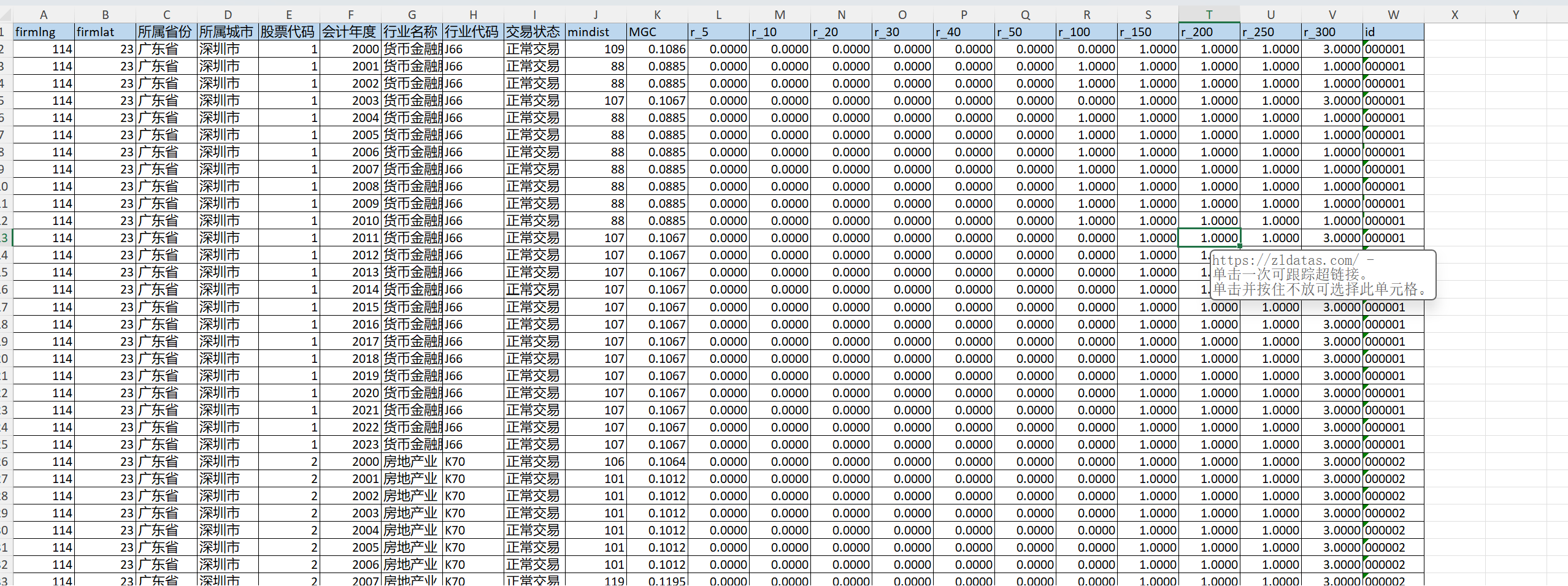 经度坐标、 纬度坐标、所属省份、所属城市、股票代码、会计年度、行业名称、行业代码、交易状态、mindist、MGC、r_5、r_10、r_20、r_30、r_40、r_50、r_100、r_150、r_200、r_250、r_300、id。