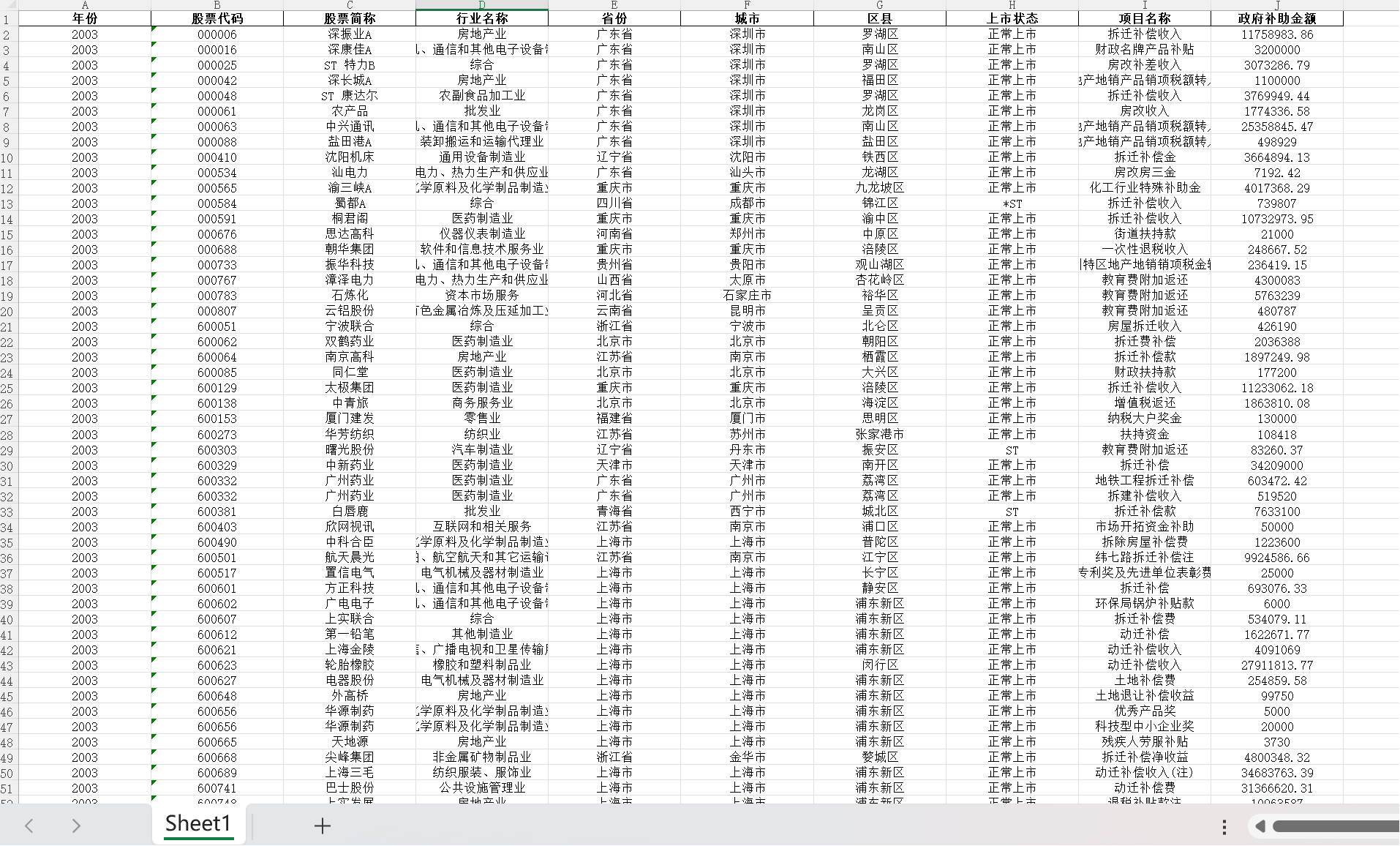 年份 股票代码 股票简称 行业名称 省份 城市 区县 上市状态 项目名称 ZF补助金额