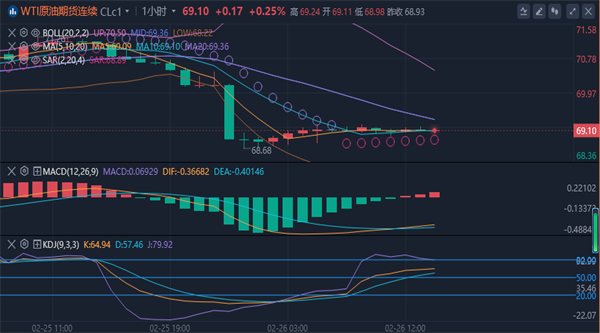 周三(2月26日)亚洲时段,美原油低位徘徊,目前交投于69.09美元/桶附近。隔夜美原油大跌2.52%,收报69.12美元/桶,盘中最低曾触及68.68美元/桶,为12月23日以来新低。