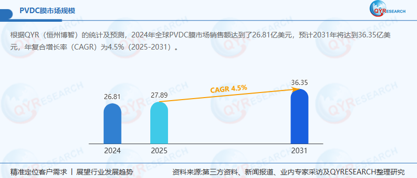 近年来,全球PVDC膜市场呈现出稳步增长的态势。根据QYR(恒州博智)的统计及预测,2024年全球PVDC膜市场销售额达到了26.81亿美元,预计2031年将达到36.35亿美元,年复合增长率(CAGR)为4.5%(2025-2031)。这一增长主要得益于食品和医药行业的快速发展,以及对高品质包装材料需求的不断增加。特别是在新兴经济体中,随着人们生活水平的提高和消费观念的转变,对高端包装的需求日益旺盛,进一步推动了PVDC膜市场的扩张。