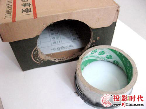 下面就要安装投影仪的镜头了,在鞋盒里面安上一个用完的透明胶带的纸环,用胶条粘住,然后在将放大镜粘在前面,这样镜头就做好了。