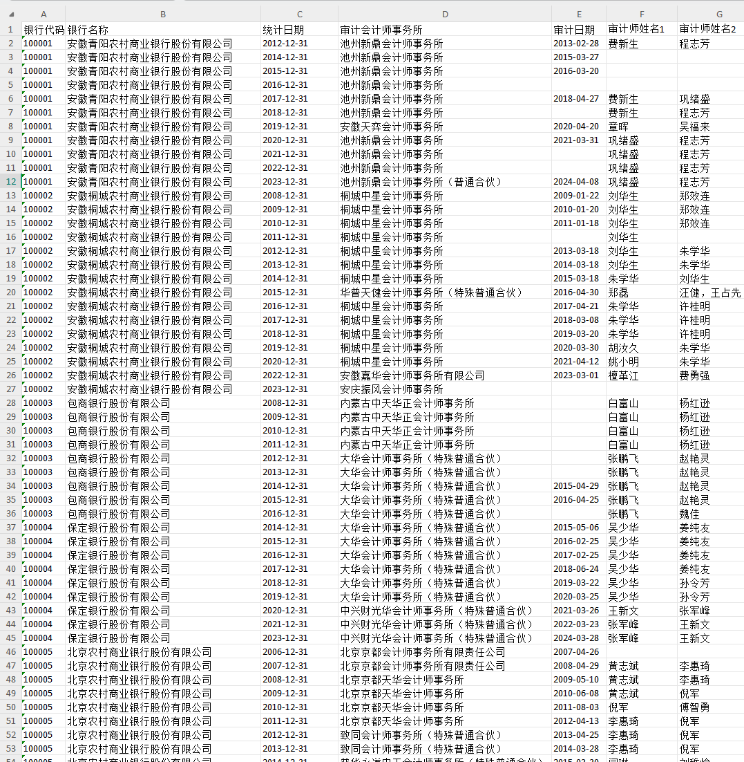 6.银行审计:银行代码 银行名称 统计日期 审计会计师事务所 审计日期 审计师姓名1 审计师姓名2 审计费用