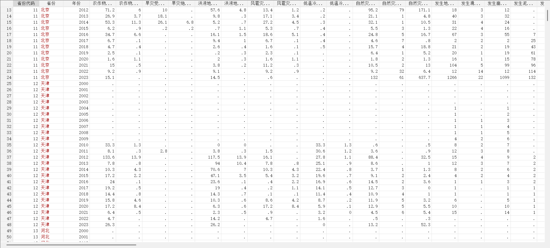 省级面板数据(2000-2023):农作物受灾、旱灾洪涝地震山体滑坡泥石流低温火灾等自然灾害、森林鼠兔病虫害、地震灾害情况