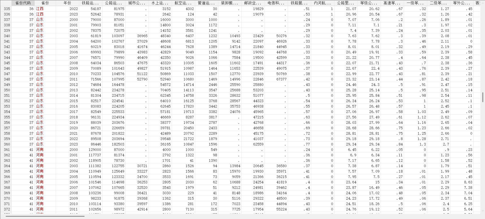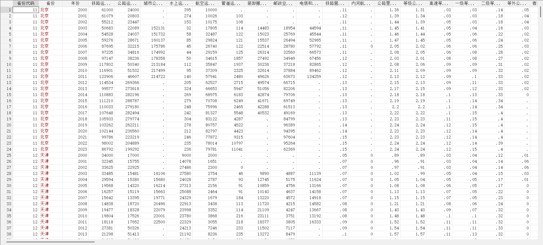 省级面板数据(2000-2023):交通基础设施、铁路公路水路航空公共交通就业人数、公路铁路高速公路里程客运量货运量、各类汽车拥有量