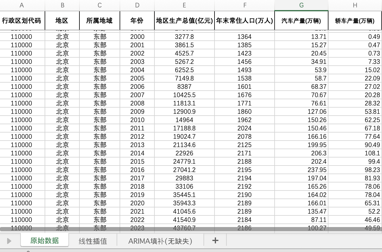 全国31省份汽车量产轿车量产数据含GDP人口(插值填补无缺失版)