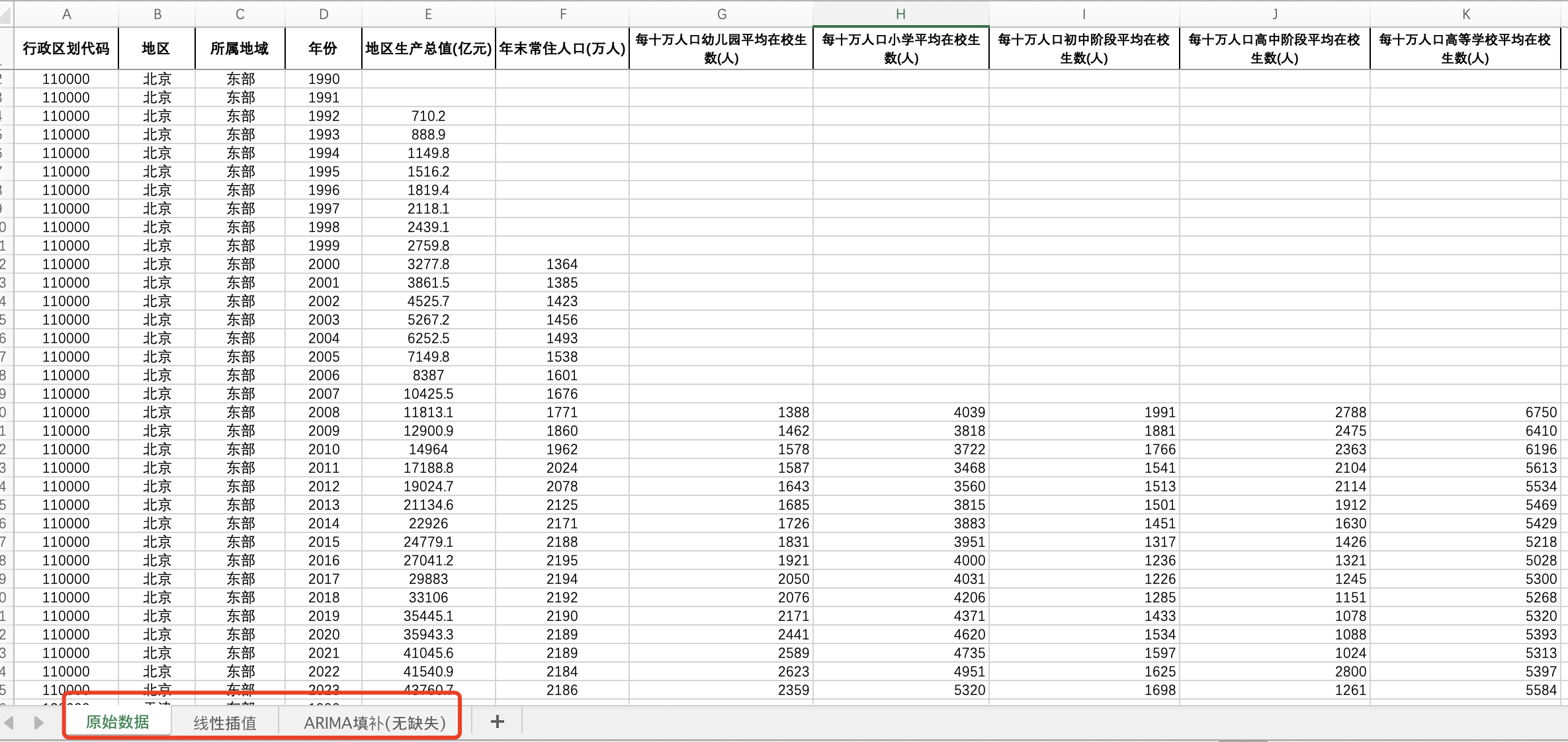 数据名称:全国31省份每十万人口平均在校生数幼儿园小学中学高中高等学校在校生数(插值填补无缺失版)