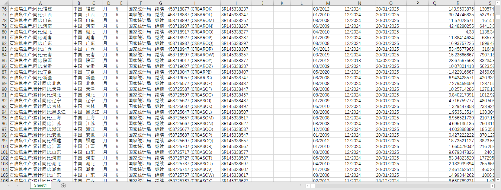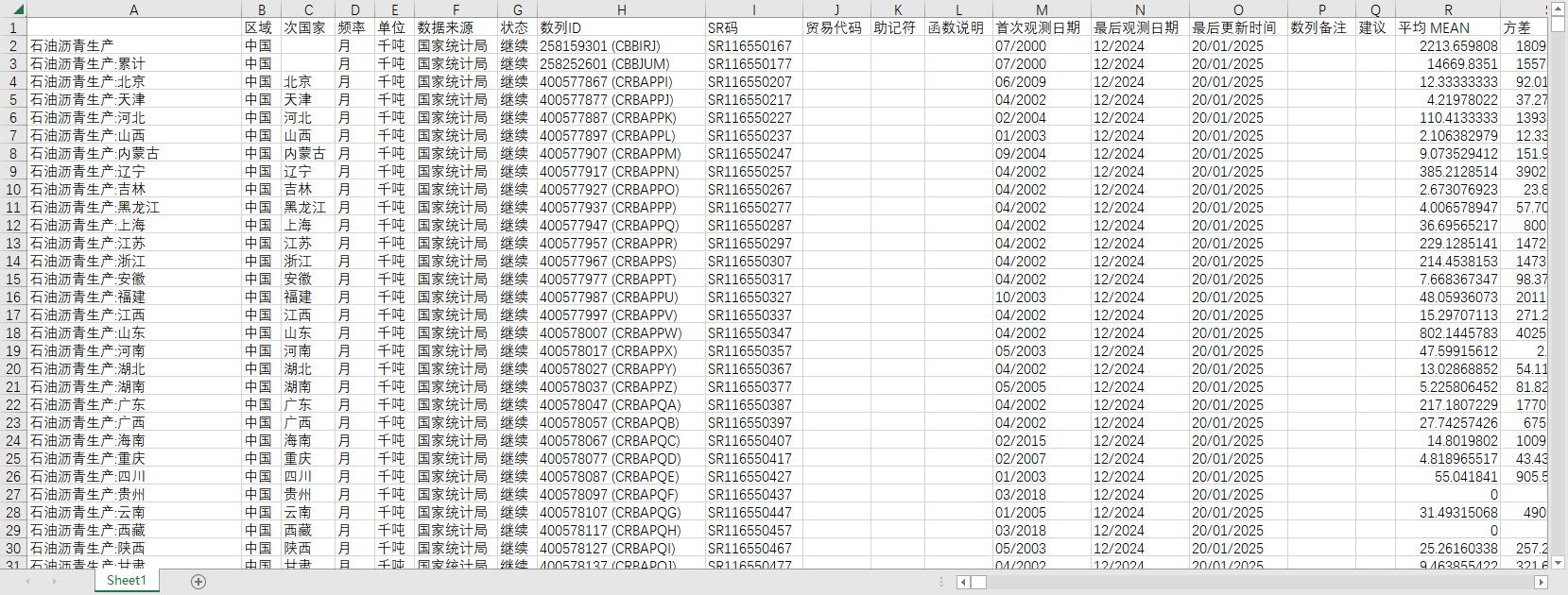 中国全国能源生产量石油沥青石脑油石油焦2002-2024月度数据细分31个省份地区累计同比