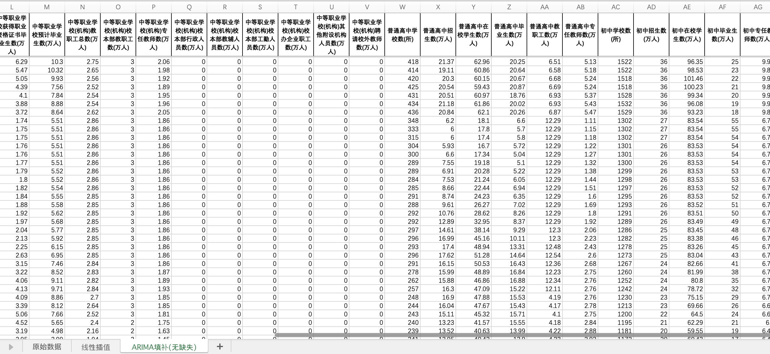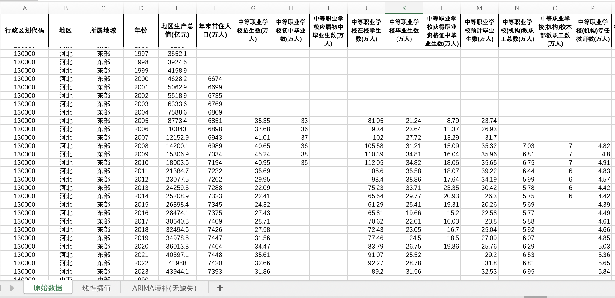 全国31省份中学数据职业中学普通中学学校数招生数中学在校学生数教师数(插值填补无缺失版)
