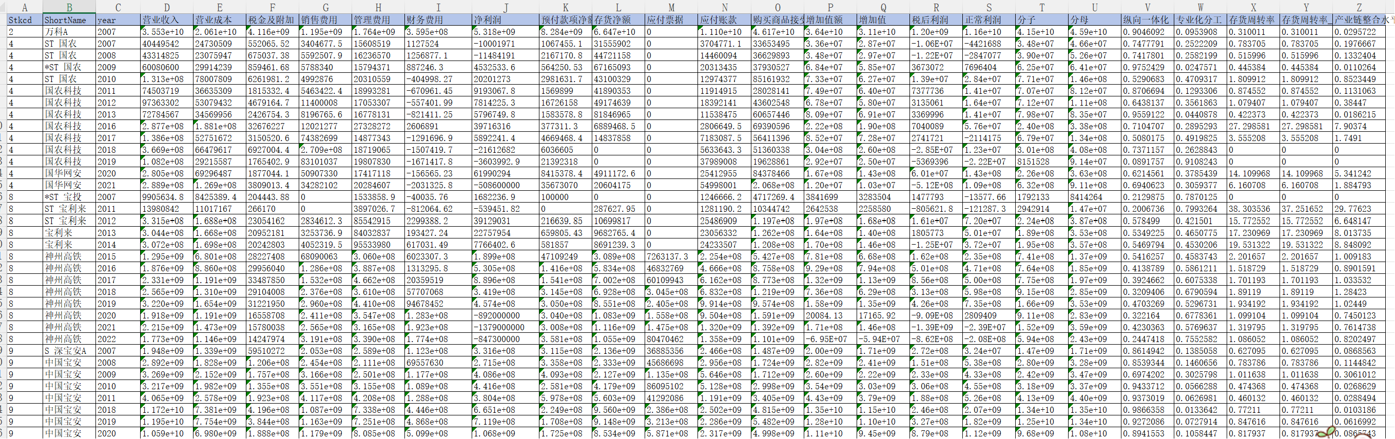代码 企业名称 年份 营业收入 营业成本 税金及附加 销售费用 管理费用 财务费用 净利润 预付款项净额 存货净额 应付票据 应付账款 购买商品接受劳务支付的现金 增加值额 增加值 税后利润 正常利润 分子 分母 纵向一体化 专业化分工 存货周转率 存货周转率_w 产业链整合水平