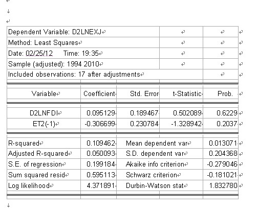 一般的教科书都是这种简单形式的E C M,如果你看文献足够多的话就会发现,这种形式其实问题很多,因为,在一元协整回归中,很有可能涉及遗漏变量,联立误差等问题。此外,也要考虑到异方差,相关性问题,这些都没有看到相关结果。