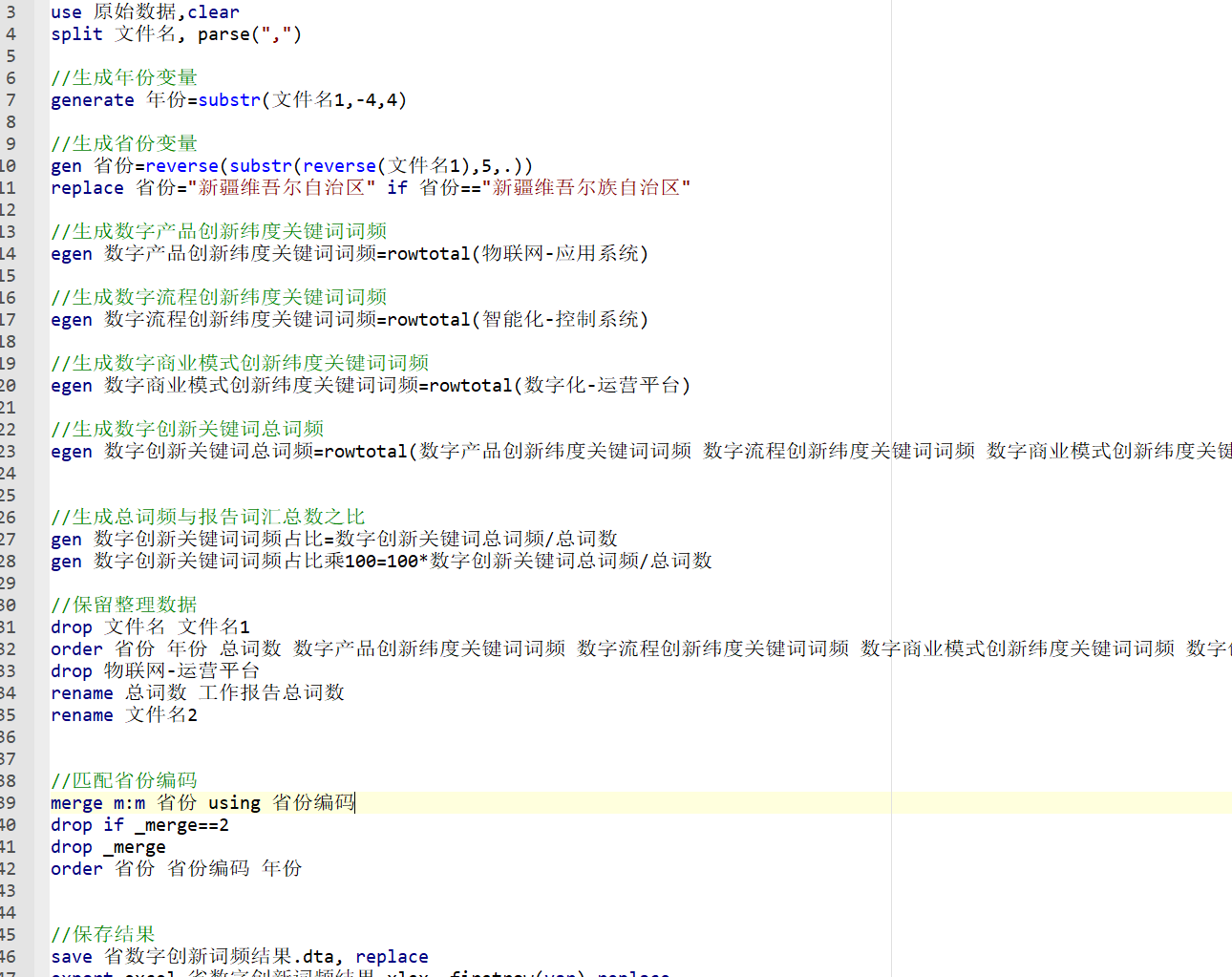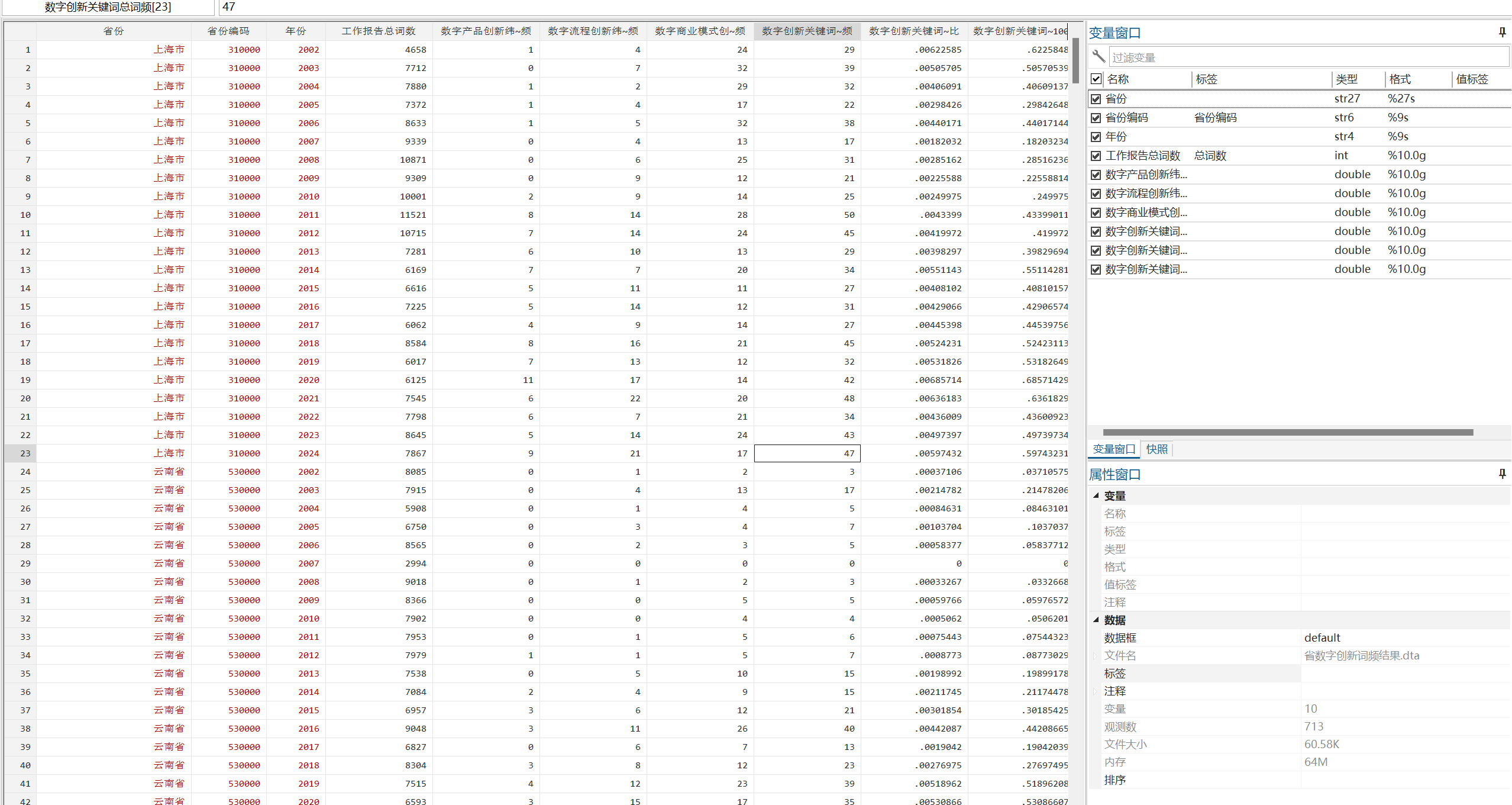 处理说明:原始数据为使用Python对地方政府工作报告进行文本分析后获得(jieba分词,停用词表使用哈工大停用词表),后续使用Stata进行整理,最终形成面板数据形式
