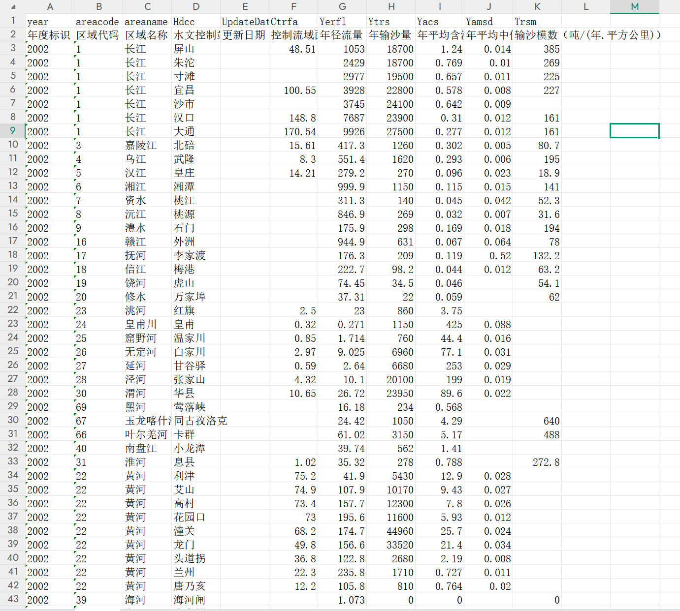 ▪ 数据说明:各地区河流年径流量及含沙量数据包括年度标识、区域代码、区域名称、水文控制站、控制流域面积(万平方公里)、年径流量(亿立方米)、年输沙量(万吨)、年平均含沙量(千克/立方米)、年平均中值粒径(毫米)、输沙模数(吨/(年.平方公里))等变量,数据通过stata或excel打开。