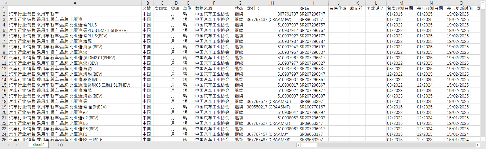 中国全国汽车销量销售数量累计乘用车轿车分品牌车型2015-202501月度比亚迪长安吉利