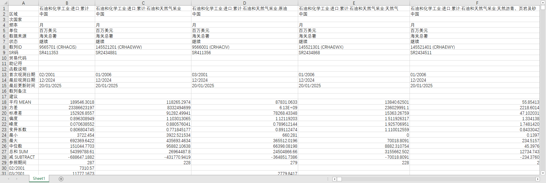 石油和化学工业:进口:累计 石油和化学工业:进口:累计:石油和天然气采业 石油和化学工业:进口:累计:石油和天然气采业:原油 石油和化学工业:进口:累计:石油和天然气采业:天然气 石油和化学工业:进口:累计:石油和天然气采业:天然沥青、页岩及砂 石油和化学工业:进口:累计:原油加工和石油制品 石油和化学工业:进口:累计:原油加工和石油制品:成品油 石油和化学工业:进口:累计:原油加工和石油制品:成品油:汽油 石油和化学工业:进口:累计:原油加工和石油制品:成品油:煤油 石油和化学工业:进口:累计:原油加工和石油制品:成品油:柴油 石油和化学工业:进口:累计:原油加工和石油制品:石脑油 石油和化学工业:进口:累计:原油加工和石油制品:燃料油 石油和化学工业:进口:累计:原油加工和石油制品:润滑油、脂及基础油 石油和化学工业:进口:累计:原油加工和石油制品:石油气 石油和化学工业:进口:累计:原油加工和石油制品:石油气:液化石油气 石油和化学工业:进口:累计:原油加工和石油制品:石蜡 石油和化学工业:进口:累计:原油加工和石油制品:石油焦 石油和化学工业:进口:累计:原油加工和石油制品:石油沥青 石油和化学工业:进口:累计:原油加工和石油制品:其他 石油和化学工业:进口:累计:化工产品 石油和化学工业:进口:累计:化工产品:无机化学品 石油和化学工业:进口:累计:化工产品:有机化学品 石油和化学工业:进口:累计:化工产品:化肥:实物量 石油和化学工业:进口:累计:化工产品:化肥:实物量:氮肥 石油和化学工业:进口:累计:化工产品:化肥:实物量:磷肥 石油和化学工业:进口:累计:化工产品:化肥:实物量:钾肥 石油和化学工业:进口:累计:化工产品:化肥:实物量:复合肥 石油和化学工业:进口:累计:化工产品:农药 石油和化学工业:进口:累计:化工产品:农药:杀虫剂 石油和化学工业:进口:累计:化工产品:农药:杀菌剂 石油和化学工业:进口:累计:化工产品:农药:除草剂 石油和化学工业:进口:累计:化工产品:农药:其他 石油和化学工业:进口:累计:化工产品:合成树脂 石油和化学工业:进口:累计:化工产品:合成树脂:聚乙烯 石油和化学工业:进口:累计:化工产品:合成树脂:聚丙烯 石油和化学工业:进口:累计:化工产品:合成树脂:聚氯乙烯 石油和化学工业:进口:累计:化工产品:合成树脂:聚苯乙烯 石油和化学工业:进口:累计:化工产品:合成树脂:ABS树脂 石油和化学工业:进口:累计:化工产品:合成树脂:环氧树脂 石油和化学工业:进口:累计:化工产品:合成树脂:聚碳酸酯 石油和化学工业:进口:累计:化工产品:合成树脂:聚硅氧烷 石油和化学工业:进口:累计:化工产品:合成树脂:塑料废碎料 石油和化学工业:进口:累计:化工产品:合成树脂:其他 石油和化学工业:进口:累计:化工产品:合成橡胶 石油和化学工业:进口:累计:化工产品:合成橡胶:丁苯橡胶 石油和化学工业:进口:累计:化工产品:合成橡胶:丁二烯橡胶 石油和化学工业:进口:累计:化工产品:合成橡胶:丁基橡胶 石油和化学工业:进口:累计:化工产品:合成橡胶:氯丁橡胶 石油和化学工业:进口:累计:化工产品:合成橡胶:丁腈橡胶 石油和化学工业:进口:累计:化工产品:合成橡胶:异戊二烯橡胶 石油和化学工业:进口:累计:化工产品:合成橡胶:乙丙橡胶 石油和化学工业:进口:累计:化工产品:合成橡胶:其他 石油和化学工业:进口:累计:化工产品:合成纤维单体 石油和化学工业:进口:累计:化工产品:合成纤维单体:乙二醇 石油和化学工业:进口:累计:化工产品:合成纤维单体:对苯二甲酸 石油和化学工业:进口:累计:化工产品:合成纤维单体:对苯二甲酸二甲酯 石油和化学工业:进口:累计:化工产品:合成纤维单体:己二酸己二胺盐 石油和化学工业:进口:累计:化工产品:合成纤维单体:己内酰胺 石油和化学工业:进口:累计:化工产品:合成纤维单体:丙烯腈 石油和化学工业:进口:累计:化工产品:合成纤维聚合物 石油和化学工业:进口:累计:化工产品:合成纤维聚合物:聚酯 石油和化学工业:进口:累计:化工产品:合成纤维聚合物:聚酰胺 石油和化学工业:进口:累计:化工产品:合成纤维聚合物:聚乙烯醇 石油和化学工业:进口:累计:化工产品:橡胶制品 石油和化学工业:进口:累计:化工产品:橡胶制品:新充气橡胶轮胎 石油和化学工业:进口:累计:化工产品:橡胶制品:橡胶内胎 石油和化学工业:进口:累计:化工产品:橡胶制品:翻新轮胎 石油和化学工业:进口:累计:化工产品:橡胶制品:橡胶带 石油和化学工业:进口:累计:化工产品:橡胶制品:胶管 石油和化学工业:进口:累计:化工产品:橡胶制品:手套 石油和化学工业:进口:累计:化工产品:橡胶制品:胶鞋类 石油和化学工业:进口:累计:化工产品:橡胶制品:胶鞋类:防水鞋靴 石油和化学工业:进口:累计:化工产品:橡胶制品:胶鞋类:滑雪、防护鞋 石油和化学工业:进口:累计:化工产品:橡胶制品:胶鞋类:运动、网球、篮球鞋 石油和化学工业:进口:累计:化工产品:橡胶制品:其他 石油和化学工业:进口:累计:化工产品:涂料、油墨、颜料等 石油和化学工业:进口:累计:化工产品:涂料、油墨、颜料等:染料 石油和化学工业:进口:累计:化工产品:涂料、油墨、颜料等:颜料 石油和化学工业:进口:累计:化工产品:涂料、油墨、颜料等:涂料 石油和化学工业:进口:累计:化工产品:涂料、油墨、颜料等:油墨 石油和化学工业:进口:累计:化工产品:专