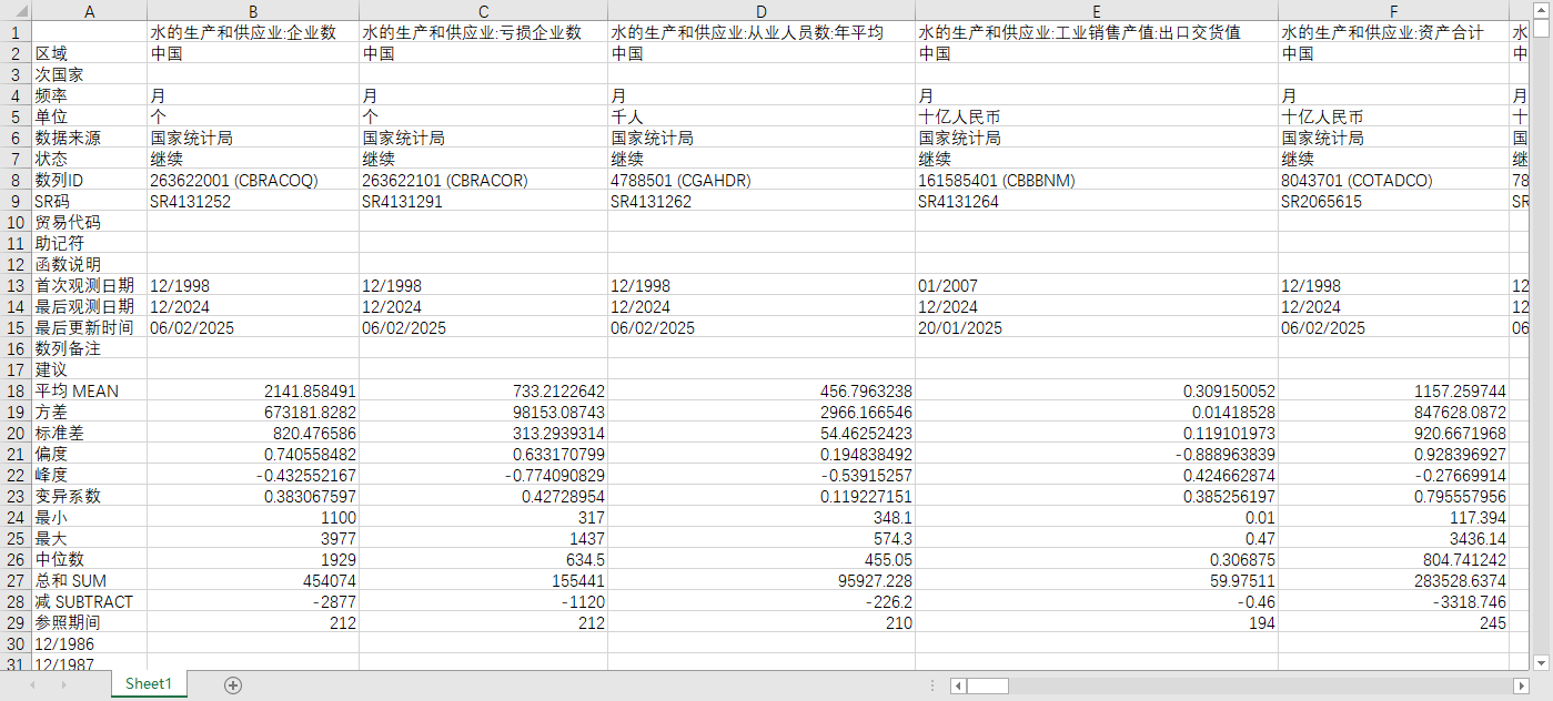 水的生产和供应业:企业数 水的生产和供应业:亏损企业数 水的生产和供应业:从业人员数:年平均 水的生产和供应业:工业销售产值:出口交货值 水的生产和供应业:资产合计 水的生产和供应业:流动资产 水的生产和供应业:应收账款净额 水的生产和供应业:存货 水的生产和供应业:存货:产成品 水的生产和供应业:固定资产净值 水的生产和供应业:负债合计 水的生产和供应业:营业收入:累计 水的生产和供应业:营业成本:累计 水的生产和供应业:主营业务税金及附加:累计 水的生产和供应业:主营业务利润:累计 水的生产和供应业:营业费用:累计 水的生产和供应业:管理费用:累计 水的生产和供应业:财务费用:累计 水的生产和供应业:财务费用:累计:利息支出 水的生产和供应业:税金总额:累计 水的生产和供应业:投资收益:累计 水的生产和供应业:营业利润:累计 水的生产和供应业:利润总额:累计 水的生产和供应业:应交增值税:累计 水的生产和供应业:亏损额:累计 水的生产和供应业:总资产贡献率 水的生产和供应业:资产负债率 水的生产和供应业:流动资金周转率 水的生产和供应业:成本费用利润率 水的生产和供应业:毛利率 水的生产和供应业:营业收入利润率 水的生产和供应业:累计同比:亏损企业数 水的生产和供应业:累计同比:从业人员数:年平均 水的生产和供应业:同比:工业增加值 水的生产和供应业:累计同比:工业增加值 水的生产和供应业:同比:工业销售产值:出口交货值 水的生产和供应业:累计同比:资产合计 水的生产和供应业:累计同比:流动资产 水的生产和供应业:累计同比:应收账款 水的生产和供应业:累计同比:存货 水的生产和供应业:累计同比:存货:产成品 水的生产和供应业:累计同比:固定资产净值 水的生产和供应业:累计同比:负债合计 水的生产和供应业:累计同比:营业收入 水的生产和供应业:累计同比:营业成本 水的生产和供应业:累计同比:主营业务税金及附加 水的生产和供应业:累计同比:营业费用 水的生产和供应业:累计同比:管理费用 水的生产和供应业:累计同比:财务费用 水的生产和供应业:累计同比:财务费用:利息支出 水的生产和供应业:累计同比:税金总额 水的生产和供应业:累计同比:投资收益 水的生产和供应业:累计同比:营业利润 水的生产和供应业:累计同比:利润总额 水的生产和供应业:累计同比:应交增值税 水的生产和供应业:累计同比:亏损额 水的生产和供应业:企业数 水的生产和供应业:亏损企业数 水的生产和供应业:从业人员数:年平均 水的生产和供应业:工业总产值 水的生产和供应业:工业增加值 水的生产和供应业:工业销售产值 水的生产和供应业:工业销售产值:出口交货值 水的生产和供应业:劳动生产率 水的生产和供应业:资产总计 水的生产和供应业:资产总计:流动资产 水的生产和供应业:资产总计:流动资产:应收账款 水的生产和供应业:资产总计:流动资产:存货 水的生产和供应业:资产总计:流动资产:存货:产成品 水的生产和供应业:资产总计:流动资产年平均余额 水的生产和供应业:资产总计:固定资产 水的生产和供应业:资产总计:固定资产原价 水的生产和供应业:累计折旧 水的生产和供应业:累计折旧:本年折旧 水的生产和供应业:资产总计:固定资产净值 水的生产和供应业:资产总计:固定资产净值年平均余额 水的生产和供应业:负债合计 水的生产和供应业:负债合计:流动负债 水的生产和供应业:所有者权益 水的生产和供应业:所有者权益:实收资本 水的生产和供应业:所有者权益:国家资本 水的生产和供应业:所有者权益:港澳台资本 水的生产和供应业:所有者权益:外商资本 水的生产和供应业:营业收入 水的生产和供应业:营业成本 水的生产和供应业:主营业务税金及附加 水的生产和供应业:管理费用 水的生产和供应业:利息支出 水的生产和供应业:投资收益 水的生产和供应业:营业利润 水的生产和供应业:利润总额 水的生产和供应业:应交所得税 水的生产和供应业:应交增值税 水的生产和供应业:亏损额 水的生产和供应业:工业增加值率 水的生产和供应业:总资产贡献率 水的生产和供应业:资产负债率 水的生产和供应业:流动资产周转率 水的生产和供应业:成本费用利润率 水的生产和供应业:产品销售率