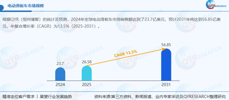 根据QYR(恒州博智)的统计及预测,2024年全球电动滑板车市场销售额达到了23.7亿美元,预计2031年将达到56.85亿美元,年复合增长率(CAGR)为13.5%(2025-2031)。