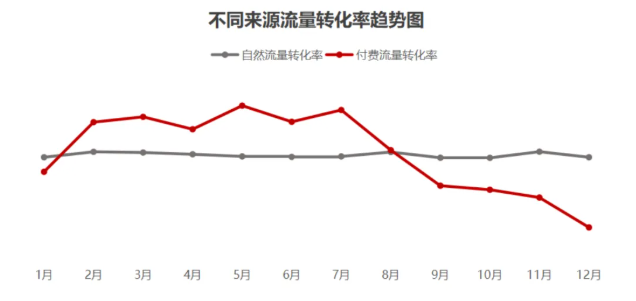 付费流量转化率下降明显,这说明:付费流量的质量下降,可能是投放渠道的用户精准度变差;付费广告可能吸引了很多低意向用户,导致他们访问但没有购买。