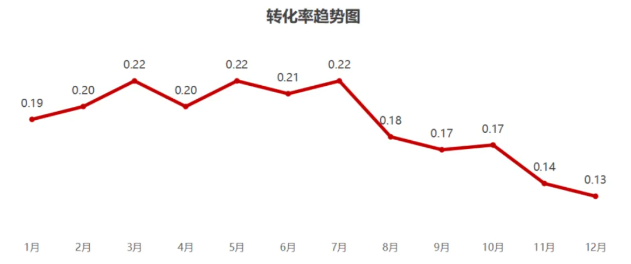 从转换率趋势图可以看出,转化率从7月的22%降低到了12月的13%,下降幅度达到9%。这说明,尽管访客数有所减少,但影响销售额的主要因素是转化率的大幅下降。