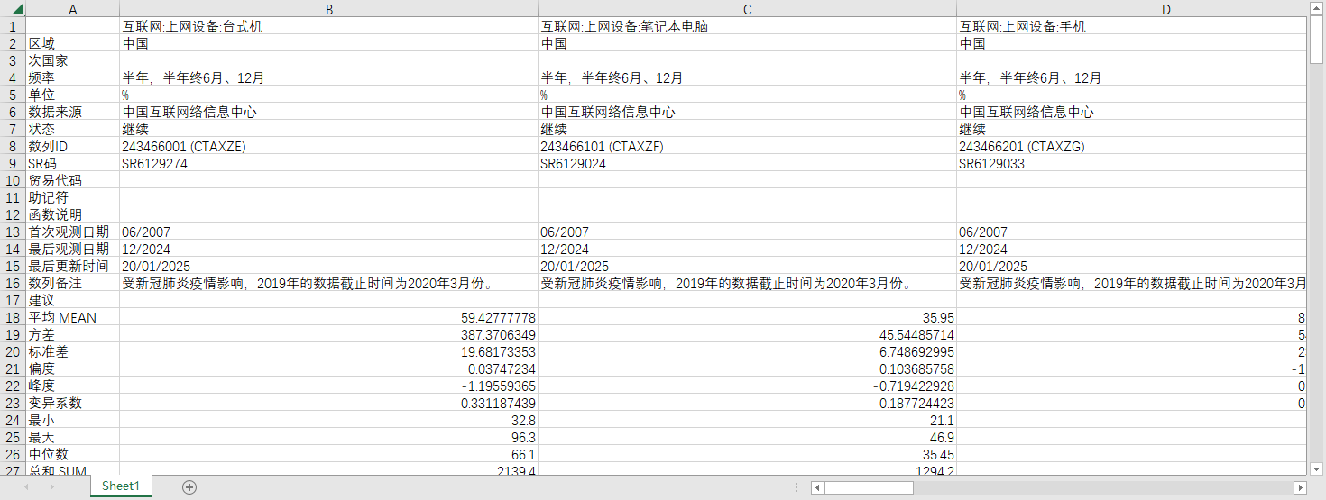 互联网:网民数 互联网:网民数:农村 互联网:网民数:城镇 互联网:网民数:手机接入 (DC)互联网:网民数:宽带接入 互联网:互联网普及率 互联网:互联网普及率:农村 互联网:互联网普及率:城镇 互联网:IPv4地址数 互联网:网民上网时长:每周