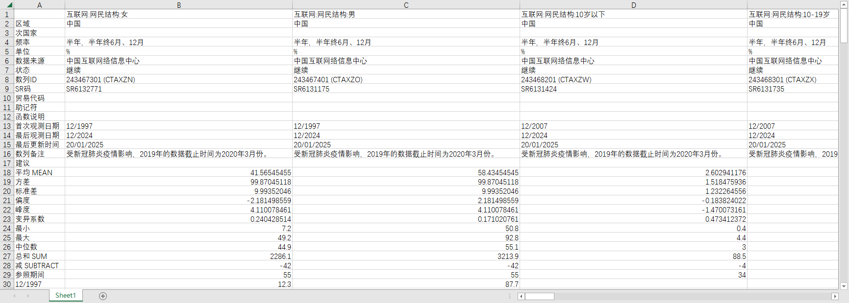 互联网:网民结构:女 互联网:网民结构:男 互联网:网民结构:10岁以下 互联网:网民结构:10-19岁 互联网:网民结构:20-29岁 互联网:网民结构:30-39岁 互联网:网民结构:40-49岁 互联网:网民结构:50-59岁 互联网:网民结构:60岁以上 互联网:网民结构:小学及以下 互联网:网民结构:初中 互联网:网民结构:高中 互联网:网民结构:大专 互联网:网民结构:本科及以上 (DC)互联网:网民结构:本科 (DC)互联网:网民结构:硕士及以上 互联网:网民结构:学生 互联网:网民结构:党政机关/事业单位领导干部 互联网:网民结构:党政机关/事业单位一般职员 互联网:网民结构:企业/公司高层管理人员 互联网:网民结构:企业/公司中层管理人员 互联网:网民结构:企业/公司一般职员 互联网:网民结构:专业技术人员 互联网:网民结构:商业服务业职工 互联网:网民结构:制造生产型企业工人 互联网:网民结构:个体户/自由职业者 互联网:网民结构:农村外出务工人员 互联网:网民结构:农林牧渔劳动者 互联网:网民结构:退休 互联网:网民结构:无业/下岗/失业 互联网:网民结构:其他 互联网:网民结构:500元以下 互联网:网民结构:501-1000元 互联网:网民结构:1001-2000元 互联网:网民结构:2001-3000元 互联网:网民结构:3001-5000元 互联网:网民结构:5000元以上 (DC)互联网:网民结构:18岁以下 (DC)互联网:网民结构:18-24岁 (DC)互联网:网民结构:25-30岁 (DC)互联网:网民结构:31-35岁 (DC)互联网:网民结构:36-40岁 (DC)互联网:网民结构:41-50岁 (DC)互联网:网民结构:50岁以上 (DC)互联网:网民结构:手机上网:18岁以下 (DC)互联网:网民结构:手机上网:18-24岁 (DC)互联网:网民结构:手机上网:25-30岁 (DC)互联网:网民结构:手机上网:31-35岁 (DC)互联网:网民结构:手机上网:36-40岁 (DC)互联网:网民结构:手机上网:41-50岁 (DC)互联网:网民结构:手机上网:50岁以上