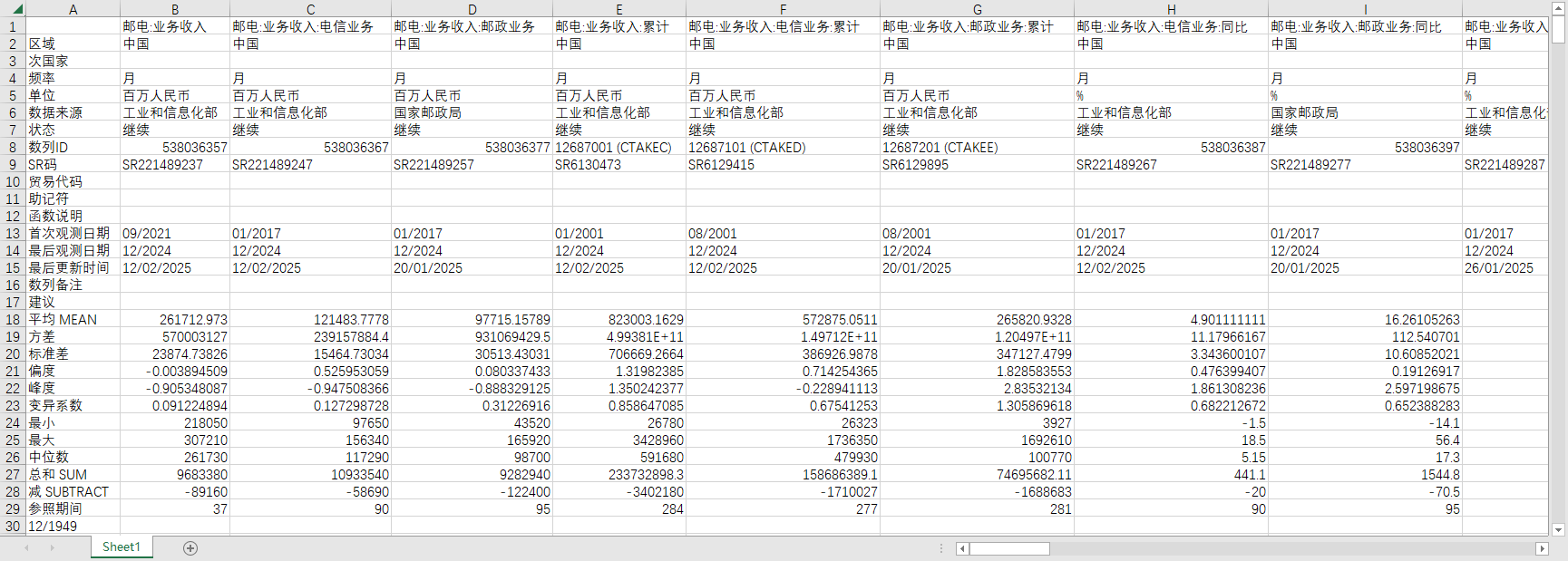 邮电:业务收入 邮电:业务收入:电信业务 邮电:业务收入:邮政业务 邮电:业务收入:累计 邮电:业务收入:电信业务:累计 邮电:业务收入:邮政业务:累计 邮电:业务收入:电信业务:同比 邮电:业务收入:邮政业务:同比 邮电:业务收入:电信业务:累计同比 邮电:业务收入:邮政业务:累计同比 邮电:业务总量(上年价格):电信业务 邮电:业务总量(2020年价):邮政业务 邮电:业务总量(上年价格):电信业务:累计 邮电:业务总量(2020年价):邮政业务:累计 (DC)邮电:业务总量(2015年价):电信业务 (DC)邮电:业务总量(2015年价):电信业务:累计 (DC)邮电:业务总量(2010年价) (DC)邮电:业务总量(2010年价):电信业务 (DC)邮电:业务总量(2010年价):邮政业务 (DC)邮电:业务总量(2010年价):累计 (DC)邮电:业务总量(2010年价):电信业务:累计 (DC)邮电:业务总量(2010年价):邮政业务:累计 (DC)邮电:业务总量(2000年价) (DC)邮电:业务总量(2000年价):电信业务 (DC)邮电:业务总量(2000年价):邮政业务 (DC)邮电:业务总量(2000年价):累计 (DC)邮电:业务总量(2000年价):电信业务:累计 (DC)邮电:业务总量(2000年价):邮政业务:累计 (DC)邮电:业务总量(1990年价) 邮电:业务总量(2020年价) 邮电:业务总量(上年价格):电信业务 邮电:业务总量(2020年价):邮政业务 (DC)邮电:业务总量(2010年价) (DC)邮电:业务总量(2010年价):电信业务 (DC)邮电:业务总量(2010年价):邮政业务 (DC)邮电:业务总量(2000年价) (DC)邮电:业务总量(2000年价):电信业务 (DC)邮电:业务总量(2000年价):邮政业务 (DC)邮电:业务总量(1990年价) (DC)邮电:业务总量(1990年价):电信业务 (DC)邮电:业务总量(1990年价):邮政业务