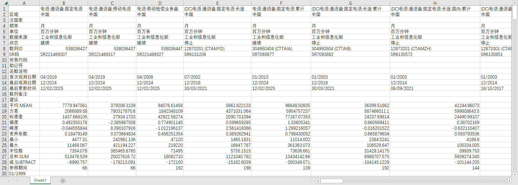 电话:通话量:固定电话 电话:通话量:移动电话 电话:移动短信业务量 (DC)电话:通话量:固定电话:长途 电话:通话量:固定电话:累计 (DC)电话:通话量:固定电话:长途:累计 (DC)电话:通话量:固定电话:长途:国内:累计 (DC)电话:通话量:固定电话:长途:国际:累计 (DC)电话:通话量:固定电话:长途:港澳台:累计 (DC)电话:通话量:固定电话:本地:累计 (DC)电话:通话量:固定电话:本地:区间:累计 (DC)电话:通话量:固定电话:本地:区内及拨号上网:累计 电话:通话量:移动电话:累计 电话:通话量:移动电话:去话:累计 (DC)电话:通话量:移动电话:长途:累计 (DC)电话:通话量:移动电话:长途:国内:累计 (DC)电话:通话量:移动电话:长途:国际:累计 (DC)电话:通话量:移动电话:长途:港澳台:累计 (DC)电话:通话量:移动电话:本地:累计 (DC)电话:通话量:IP电话:累计 (DC)电话:通话量:IP电话:国内:累计 (DC)电话:通话量:IP电话:国际:累计 (DC)电话:通话量:IP电话:港澳台:累计 (DC)电话:通话量:固定电话:本地网内:区间:累计 (DC)电话:通话量:固定电话:本地网内:区内:累计 (DC)电话:通话量:固定电话:本地网内:拨号上网:累计 (DC)电话:通话量:长途电话 电话:移动短信业务量:累计 电话:通话量:固定电话:同比 电话:通话量:移动电话:同比 电话:移动短信业务量:同比 电话:通话量:固定电话:累计同比 电话:通话量:移动电话:累计同比 电话:移动短信业务量:累计同比 电话:用户数 电话:用户数:移动电话 (DC)电话:用户数:无线寻呼 互联网:用户数:宽带接入 互联网:用户数:宽带接入:xDSL (DC)互联网:用户数:拨号 (DC)互联网:用户数:拨号及专线 (DC)互联网:用户数:专线 移动互联网:用户数 移动互联网:接入流量 移动互联网:接入流量:累计 移动互联网:接入流量:同比 移动互联网:接入流量:累计同比 (DC)IPTV:用户数 电信:光缆线路长度 电信:光缆线路长度:长途 (DC)电信:交换机容量:长途电话 (DC)电信:交换机容量:局用电话 (DC)电信:交换机容量:移动电话 (DC)电信:线路长度:本地网中继光缆 (DC)电信:线路长度:数字微波 (DC)电信:电话电路:2Mbps:长途 电话:普及率:每百人移动电话 电话:普及率:每百人固定电话 (DC)电话:普及率:已通固定电话的行政村 (DC)电话:普及率:每百人固定电话:城市 (DC)电话:普及率:每百人电话 (DC)电信:电报 (DC)电信:传真 (DC)电信:用户数:数据服务