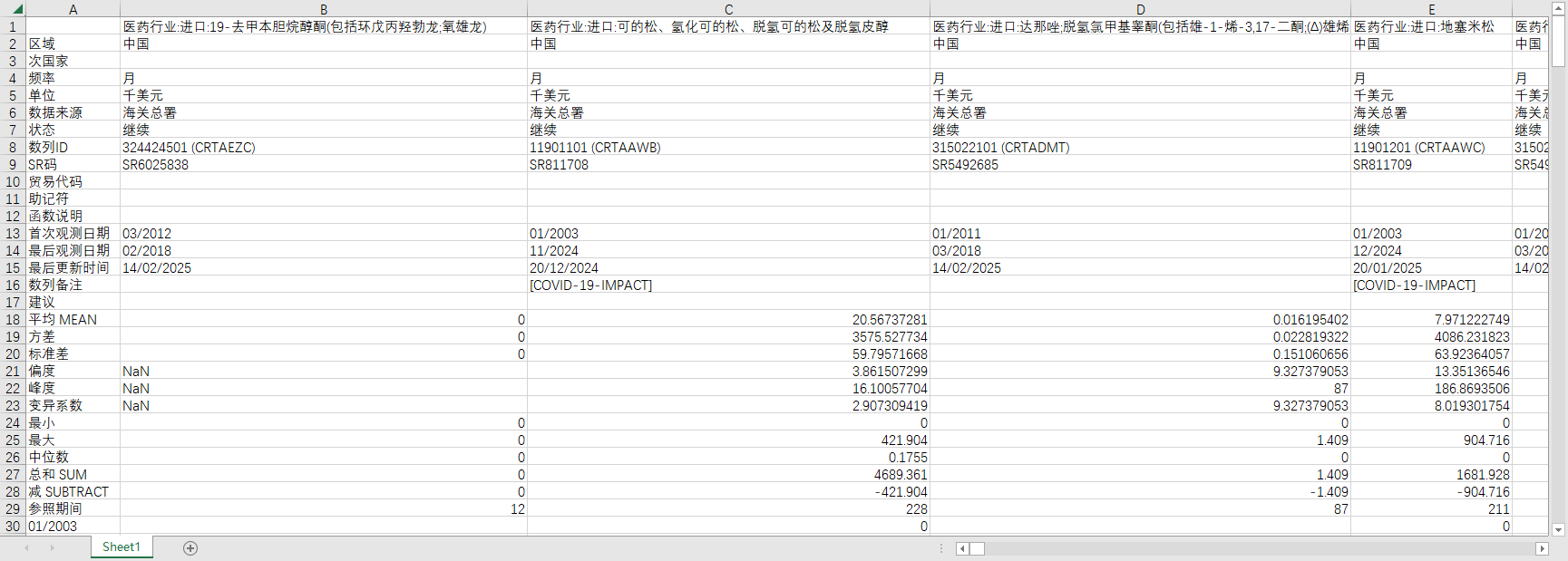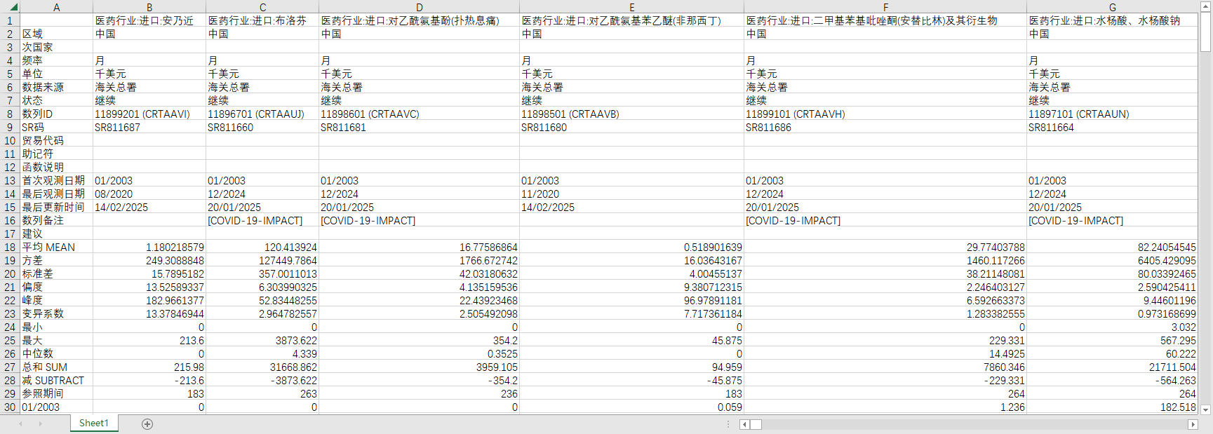 进口:19-去甲本胆烷醇酮(包括环戊丙羟勃龙;氧雄龙) 进口:可的松、氢化可的松、脱氢可的松及脱氢皮醇 进口:达那唑;脱氢氯甲基睾酮(包括雄-1-烯-3,17-二酮;(Δ)雄烯二醇;普拉睾酮;去氧甲基睾酮) 进口:地塞米松 进口:促性素 进口:甲基-1-睾酮;甲睾酮;甲基去甲睾酮(包括17α-甲基-17β-羟基雌-4,9(10)-二烯-3-酮;去甲雄酮) 进口:米勃酮;诺龙;诺勃酮;诺司替勃(包括19-去甲雄烯二醇;19-去甲雄烯二酮;诺乙雄龙) 进口:前列腺素、血栓烷等及其衍生物和结构类似物 进口:奎勃龙;司坦唑醇;司腾勃龙(包括1-睾酮;睾酮;群勃龙) 进口:泽仑诺;孕三烯酮;替勃龙(包括四氢孕三烯酮) 进口:其他皮质甾类激素的卤化衍生物 进口:其他雌(甾)激素及孕激素 进口:其他多肽激素及衍生物和结构类似物(包括蛋白激素、糖蛋白激素及其衍生物和结构类似物) 进口:其他甾族激素及其衍生物和结构类似物 进口:其他激素及其衍生物和结构类似物 进口:生长激素的衍生物和结构类似物 进口:7-羰基-普拉睾酮 进口:雄甾-4-烯-3,17-二酮 进口:含有胰岛素的药品,未配定剂量 进口:其他含有激素或税目2937的其他产品,但不含抗菌素,未配定剂量 进口:已配剂量含其他皮质甾类激素的药品(包括其衍生物及结构类似物,不含抗菌素,包括零售包装) 进口:已配剂量含1-睾酮或睾酮的单方制剂(包括其衍生物及结构类似物,包括零售包装) 进口:已配剂量含促性素的单方制剂(包括零售包装) 进口:已配剂量含生长激素的单方制剂(包括零售包装) 进口:已配剂量含奎勃龙或替勃龙或群勃龙的单方制剂(包括其衍生物及结构类似物,制成零售包装) 进口:已配剂量含重组人胰岛素的单方制剂(包括零售包装) 进口:其他已配剂量含人胰岛素的单方制剂(包括零售包装) 进口:已配剂量含重组人胰岛素的其他药品(不含抗菌素,包括零售包装) 进口:其他已配剂量含胰岛素的其他药品(不含抗菌素,包括零售包装) 进口:兽用血促性素,绒促性素制剂(包括零售包装) 进口:其他已配剂量含激素或品目2937产品的药品(不含抗菌素,包括零售包装) (DC)医药行业:进口:肾上腺素 (DC)医药行业:进口:促红素(EPO)及其类似物 (DC)医药行业:进口:生长激素及其衍生物和结构类似物 (DC)医药行业:进口:其他儿茶酚胺激素及其衍生物和结构类似物 (DC)医药行业:进口:其他天然或合成再制的激素,包括改性链多肽 (DC)医药行业:进口:已配剂量含促红素(EPO)及其类似物的单方制剂(包括零售包装) (DC)医药行业:进口:已配剂量含胰岛素样生长因子1的单方制剂(包括零售包装) 出口:19-去甲本胆烷醇酮(包括环戊丙羟勃龙;氧雄龙) 出口:可的松、氢化可的松、脱氢可的松及脱氢皮醇 出口:达那唑;脱氢氯甲基睾酮(包括雄-1-烯-3,17-二酮;(Δ)雄烯二醇;普拉睾酮;去氧甲基睾酮) 出口:地塞米松 出口:促性素 出口:甲基-1-睾酮;甲睾酮;甲基去甲睾酮(包括17α-甲基-17β-羟基雌-4,9(10)-二烯-3-酮;去甲雄酮) 出口:米勃酮;诺龙;诺勃酮;诺司替勃(包括19-去甲雄烯二醇;19-去甲雄烯二酮;诺乙雄龙) 出口:前列腺素、血栓烷等及其衍生物和结构类似物 出口:奎勃龙;司坦唑醇;司腾勃龙(包括1-睾酮;睾酮;群勃龙) 出口:泽仑诺;孕三烯酮;替勃龙(包括四氢孕三烯酮) 出口:其他皮质甾类激素的卤化衍生物 出口:其他雌(甾)激素及孕激素 出口:其他多肽激素及衍生物和结构类似物(包括蛋白激素、糖蛋白激素及其衍生物和结构类似物) 出口:其他甾族激素及其衍生物和结构类似物 出口:其他激素及其衍生物和结构类似物 出口:生长激素的衍生物和结构类似物 出口:7-羰基-普拉睾酮 出口:雄甾-4-烯-3,17-二酮 出口:含有胰岛素的药品,未配定剂量 出口:其他含有激素或税目2937的其他产品,但不含抗菌素,未配定剂量 出口:已配剂量含其他皮质甾类激素的药品(包括其衍生物及结构类似物,不含抗菌素,包括零售包装) 出口:已配剂量含1-睾酮或睾酮的单方制剂(包括其衍生物及结构类似物,包括零售包装) 出口:已配剂量含促性素的单方制剂(包括零售包装) 出口:已配剂量含生长激素的单方制剂(包括零售包装) 出口:已配剂量含奎勃龙或替勃龙或群勃龙的单方制剂(包括其衍生物及结构类似物,制成零售包装) 出口:已配剂量含重组人胰岛素的单方制剂(包括零售包装) 出口:其他已配剂量含人胰岛素的单方制剂(包括零售包装) 出口:已配剂量含重组人胰岛素的其他药品(不含抗菌素,包括零售包装) 出口:其他已配剂量含胰岛素的其他药品(不含抗菌素,包括零售包装) 出口:兽用血促性素,绒促性素制剂(包括零售包装) 出口:其他已配剂量含激素或品目2937产品的药品(不含抗菌素,包括零售包装) (DC)医药行业:出口:肾上腺素 (DC)医药行业:出口:促红素(EPO)及其类似物 (DC)医药行业:出口:生长激素及其衍生物和结构类似物 (DC)医药行业:出口:其他儿茶酚胺激素及其衍生物和结构类似物 (DC)医药行业:出口:其他天然或合成再制的激素,包括改性链多肽 (DC)医药行业:出口:已配剂量含促红素(EPO)及其类似物的单方制剂(包括零售包装) (DC)医药行业:出口:已配剂量含胰岛素样生长因子1的单方制剂(包括零售包装) 进口:19-去甲本胆烷醇酮(包括环戊丙羟勃龙;氧雄龙) 进口:可的松、氢化可的松、脱氢可的松及脱氢皮醇 进口:达那唑;脱氢氯甲基睾酮(包括雄-1-烯-3,17-二酮;(Δ)雄烯二醇;普拉睾酮;去氧甲基睾酮) 进口:地塞米松 进口:促性素 进口:甲基-1-睾酮;甲