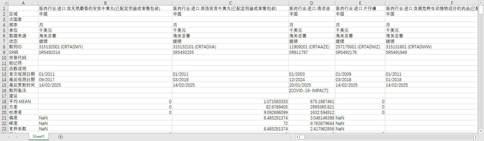 医药行业:进口:含天然麝香的安宫牛黄丸(已配定剂量或零售包装) 医药行业:进口:其他安宫牛黄丸(已配定剂量或零售包装) 医药行业:进口:清凉油 医药行业:进口:片仔癀 医药行业:进口:含濒危野生动植物成分的药品(已配定剂量或零售包装,不含紫杉醇) 医药行业:进口:含濒危动植物成分的中式成药(已配定剂量或零售包装) 医药行业:进口:含其他成分的中式成药(已配定剂量或零售包装) 医药行业:进口:沙参 医药行业:进口:鲜或干的木香(不论是否切割,压碎或研磨成粉) 医药行业:进口:胖大海 医药行业:进口:贝母 医药行业:进口:冬虫夏草 医药行业:进口:杜仲 医药行业:进口:鱼藤根、除虫菊 医药行业:进口:药料用麻黄草 医药行业:进口:菊花 医药行业:进口:槐米 医药行业:进口:枸杞 医药行业:进口:西洋参 医药行业:进口:其他鲜人参 医药行业:进口:其他未列名人参 医药行业:进口:胶黄耆树胶(卡喇杆胶) 医药行业:进口:鲜或干的黄草及枫斗(石斛)(不论是否切割,压碎或研磨成粉) 医药行业:进口:甘草 医药行业:进口:罂粟子 医药行业:进口:茯苓 医药行业:进口:当归 医药行业:进口:黄芪 医药行业:进口:党参 医药行业:进口:白芍 医药行业:进口:田七 医药行业:进口:地黄 医药行业:进口:白术 医药行业:进口:黄连 医药行业:进口:天麻 医药行业:进口:川芎 医药行业:进口:半夏 医药行业:进口:大黄、籽黄 医药行业:进口:番红花 医药行业:进口:黄岑 医药行业:进口:牛油树果 医药行业:进口:青蒿 医药行业:进口:鲜或干的红豆杉皮、枝叶等 医药行业:进口:姜黄 医药行业:进口:乳香、没药及血竭 医药行业:进口:主要用作药料的濒危植物(包括其某部分,不论是否切割、压碎或研磨成粉) 医药行业:进口:主要用作药料的植物(包括其某部分,不论是否切割、压碎或研磨成粉) 医药行业:进口:其他鲜或干的杀虫、杀菌用植物(不论是否切割,压碎或研磨成粉) 医药行业:进口:鹿茸及其粉末 医药行业:进口:海龙、海马 医药行业:进口:龟壳、鲸须、其他兽胶、蹄、甲爪及喙等 医药行业:进口:其他濒危野生动物胆汁及其他产品 医药行业:进口:其他濒危野生兽牙、兽牙粉末及废料 医药行业:进口:胆汁,配药用腺体及其他动物产品 医药行业:进口:矿物性药材 医药行业:进口:鲜或干的苁蓉(不论是否切割,压碎或研磨成粉) (DC)医药行业:进口:白药 (DC)医药行业:进口:干的槟榔(不论是否去壳或去皮) (DC)医药行业:进口:页蒿子 (DC)医药行业:进口:蓖麻子 (DC)医药行业:进口:丁香(母丁香、公丁香及丁香梗) (DC)医药行业:进口:枯茗子 (DC)医药行业:进口:小茴香子;杜松果 (DC)医药行业:进口:肉豆蔻衣 (DC)医药行业:进口:肉豆蔻 医药行业:出口:含天然麝香的安宫牛黄丸(已配定剂量或零售包装) 医药行业:出口:其他安宫牛黄丸(已配定剂量或零售包装) 医药行业:出口:清凉油 医药行业:出口:片仔癀 医药行业:出口:含濒危野生动植物成分的药品(已配定剂量或零售包装,不含紫杉醇) 医药行业:出口:含濒危动植物成分的中式成药(已配定剂量或零售包装) 医药行业:出口:含其他成分的中式成药(已配定剂量或零售包装) 医药行业:出口:沙参 医药行业:出口:鲜或干的木香(不论是否切割,压碎或研磨成粉) 医药行业:出口:胖大海 医药行业:出口:贝母 医药行业:出口:冬虫夏草 医药行业:出口:杜仲 医药行业:出口:鱼藤根、除虫菊 医药行业:出口:药料用麻黄草 医药行业:出口:菊花 医药行业:出口:槐米 医药行业:出口:枸杞 医药行业:出口:西洋参 医药行业:出口:其他鲜人参 医药行业:出口:其他未列名人参 医药行业:出口:胶黄耆树胶(卡喇杆胶) 医药行业:出口:鲜或干的黄草及枫斗(石斛)(不论是否切割,压碎或研磨成粉) 医药行业:出口:甘草 医药行业:出口:罂粟子 医药行业:出口:茯苓 医药行业:出口:当归 医药行业:出口:黄芪 医药行业:出口:党参 医药行业:出口:白芍 医药行业:出口:田七 医药行业:出口:地黄 医药行业:出口:白术 医药行业:出口:黄连 医药行业:出口:天麻 医药行业:出口:川芎 医药行业:出口:半夏 医药行业:出口:大黄、籽黄 医药行业:出口:番红花 医药行业:出口:黄岑 医药行业:出口:牛油树果 医药行业:出口:青蒿 医药行业:出口:鲜或干的红豆杉皮、枝叶等 医药行业:出口:姜黄 医药行业:出口:乳香、没药及血竭 医药行业:出口:主要用作药料的濒危植物(包括其某部分,不论是否切割、压碎或研磨成粉) 医药行业:出口:主要用作药料的植物(包括其某部分,不论是否切割、压碎或研磨成粉) 医药行业:出口:其他鲜或干的杀虫、杀菌用植物(不论是否切割,压碎或研磨成粉) 医药行业:出口:鹿茸及其粉末 医药行业:出口:海龙、海马 医药行业:出口:龟壳、鲸须、其他兽胶、蹄、甲爪及喙等 医药行业:出口:其他濒危野生动物胆汁及其他产品 医药行业:出口:其他濒危野生兽牙、兽牙粉末及废料 医药行业:出口:胆汁,配药用腺体及其他动物产品 医药行业:出口:矿物性药材 医药行业:出口:鲜或干的苁蓉(不论是否切割,压碎或研磨成粉) (DC)医药行业:出口:白药 (DC)医药行业:出口:干的槟榔(不论是否去壳或去皮) (DC)医药行业:出口:页蒿子 (DC)医药行业:出口:蓖麻子 (DC)医药行业:出口:丁香(母丁香、公丁香及丁香梗) (DC)医药行业:出口:枯茗子 (DC)医药行业:出口:小茴香子;杜松果 (DC)医药行业:出口:肉豆蔻衣 (DC)医药行业:出口:肉豆蔻 医药行业:进