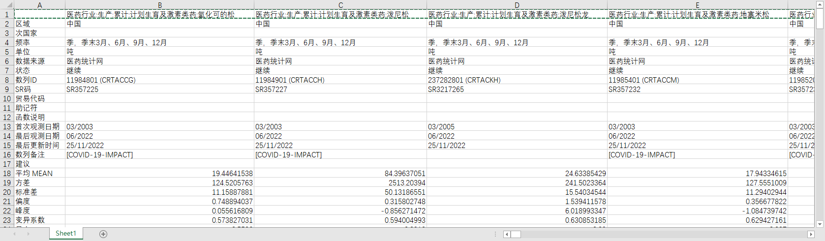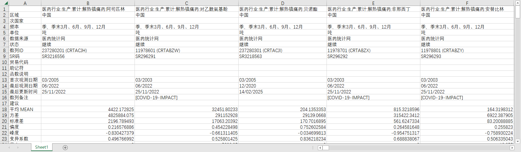 医药行业:生产:累计:解热镇痛药:阿司匹林 医药行业:生产:累计:解热镇痛药:对乙酰氨基酚 医药行业:生产:累计:解热镇痛药:贝诺酯 医药行业:生产:累计:解热镇痛药:非那西丁 医药行业:生产:累计:解热镇痛药:安替比林 医药行业:生产:累计:解热镇痛药:异丙基安替比林 医药行业:生产:累计:解热镇痛药:氨基比林 医药行业:生产:累计:解热镇痛药:安乃近 医药行业:生产:累计:解热镇痛药:保泰松 医药行业:生产:累计:解热镇痛药:曲马朵 医药行业:生产:累计:解热镇痛药:吲哚美辛 医药行业:生产:累计:解热镇痛药:吡罗昔康 医药行业:生产:累计:解热镇痛药:甲芬那酸 医药行业:生产:累计:解热镇痛药:双氯芬酸钠 医药行业:生产:累计:解热镇痛药:萘普生钠 医药行业:生产:累计:解热镇痛药:布洛芬 医药行业:生产:累计:解热镇痛药:酮洛芬 医药行业:生产:累计:解热镇痛药:芬布芬 医药行业:生产:累计:解热镇痛药:美索巴莫 (DC)医药行业:生产:累计:解热镇痛药:淀粉阿斯匹林 (DC)医药行业:生产:累计:解热镇痛药:安乃近镁盐 (DC)医药行业:生产:累计:解热镇痛药:丙磺舒 (DC)医药行业:生产:累计:解热镇痛药:氟洛芬