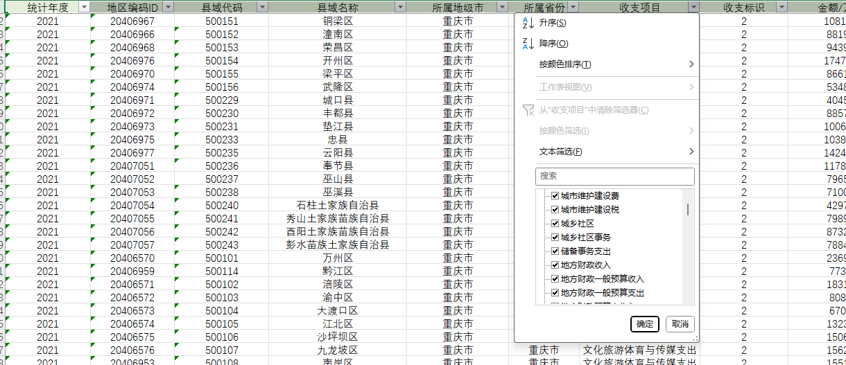 内容:县域名称、所属地级市、所属省份、收支项目、[收支标识] 收入(63项),支出(108项)、金额